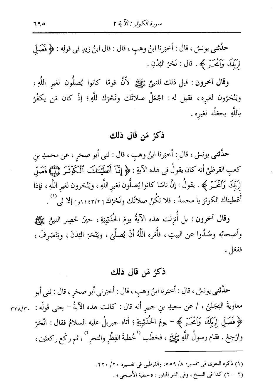 حَدَّثَنِي يُونُسُ، قَالَ: أَخْبَرَنَا ابْنُ وَهْبٍ، قَالَ: قَالَ ابْنُ زَيْدٍ، فِي قَوْلِهِ: {§فَصَلِّ لِرَبِّكَ وَانْحَرْ} [الكوثر: 2] قَالَ: «نَحْرُ الْبُدْنِ» وَقَالَ آخَرُونَ: قِيلَ ذَلِكَ لِلنَّبِيِّ صَلَّى اللهُ عَلَيْهِ وَسَلَّمَ، لِأَنَّ قَوْمًا كَانُوا يُصَلُّونَ لِغَيْرِ اللَّهِ، وَيَنْحَرُونَ لِغَيْرِهِ فَقِيلَ لَهُ. اجْعَلْ صَلَاتَكَ وَنَحْرَكَ لِلَّهِ، إِذْ كَانَ مَنْ يَكْفُرُ بِاللَّهِ يَجْعَلُهُ لِغَيْرِهِ.
