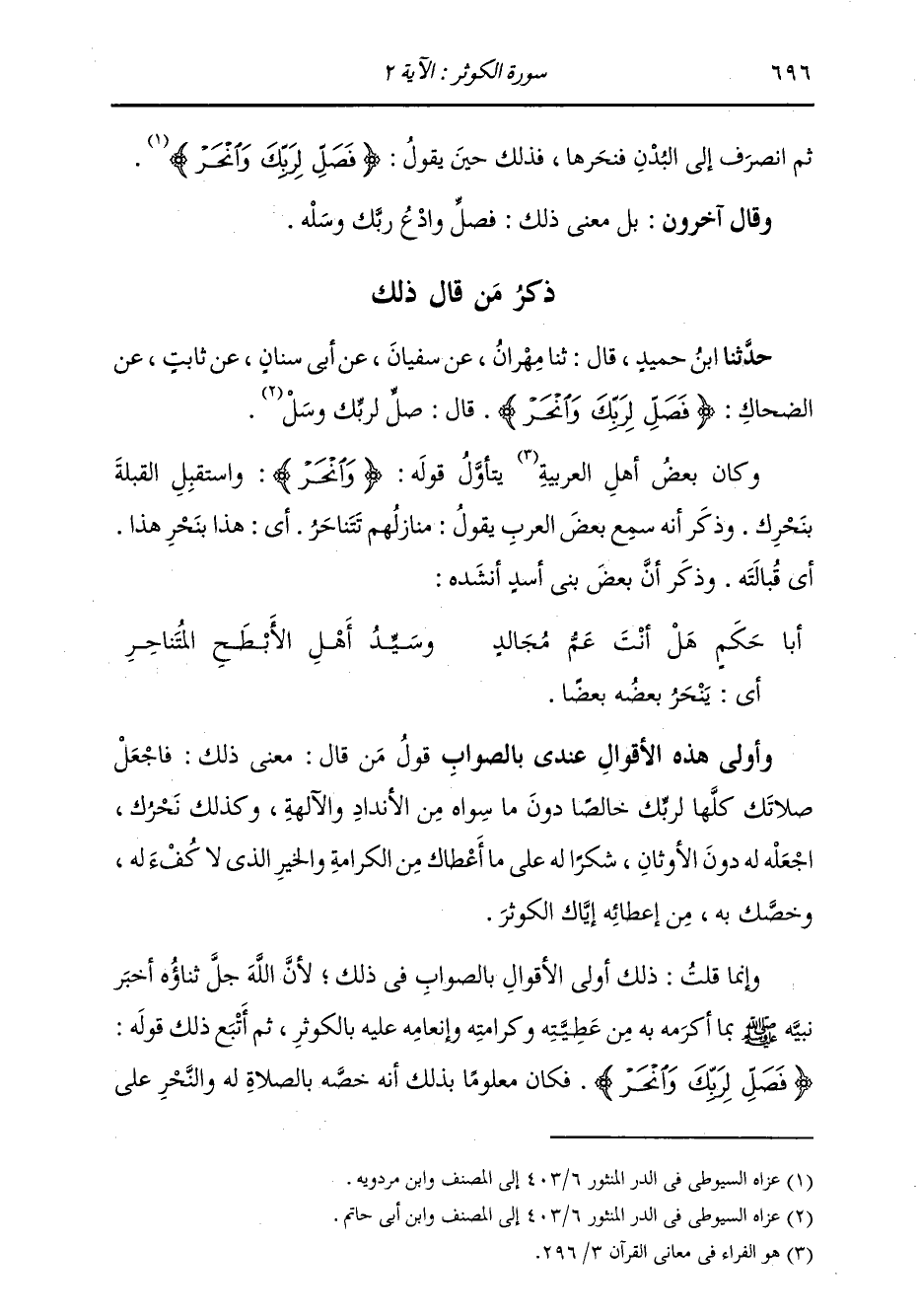 ذِكْرُ مَنْ قَالَ ذَلِكَ حَدَّثَنَا ابْنُ حُمَيْدٍ، قَالَ: ثنا مِهْرَانُ، عَنْ سُفْيَانَ، عَنْ أَبِي سِنَانٍ، عَنْ ثَابِتٍ، عَنِ الضَّحَّاكِ، {§فَصَلِّ لِرَبِّكَ وَانْحَرْ} [الكوثر: 2] قَالَ: صَلِّ لِرَبِّكَ وَسَلْ " وَكَانَ بَعْضُ أَهْلِ الْعَرَبِيَّةِ يَتَأَوَّلُ قَوْلَهُ: {وَانْحَرْ} [الكوثر: 2] وَاسْتَقْبِلِ الْقِبْلَةَ بِنَحْرِكَ. وَذُكِرَ أَنَّهُ سُمِعَ بَعْضُ الْعَرَبِ يَقُولُ: مَنَازِلُهُمْ تَتَنَاحَرُ: أَيْ هَذَا بِنَحْرِ هَذَا: أَيْ قُبَالَتَهُ. وَذُكِرَ أَنَّ بَعْضَ بَنِي أَسَدٍ أَنْشَدَهُ: