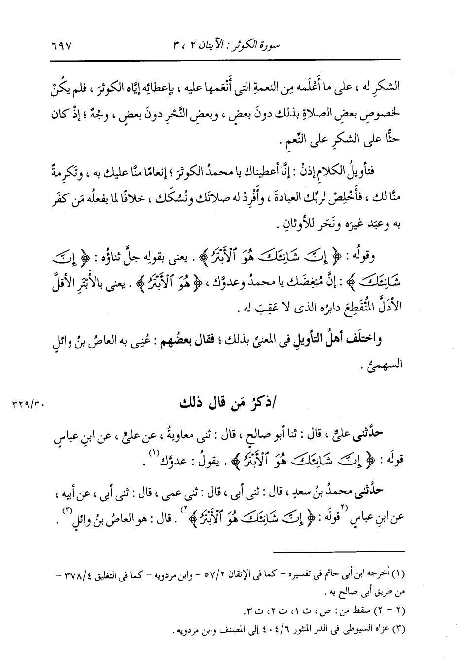 ذِكْرُ مَنْ قَالَ ذَلِكَ: حَدَّثَنِي عَلِيٌّ، قَالَ: ثنا أَبُو صَالِحٍ، قَالَ: ثني مُعَاوِيَةُ، عَنْ عَلِيٍّ، عَنِ ابْنِ عَبَّاسٍ، قَوْلُهُ: {§إِنَّ شَانِئَكَ هُوَ الْأَبْتَرُ} [الكوثر: 3] يَقُولُ: «عَدُوَّكَ»
