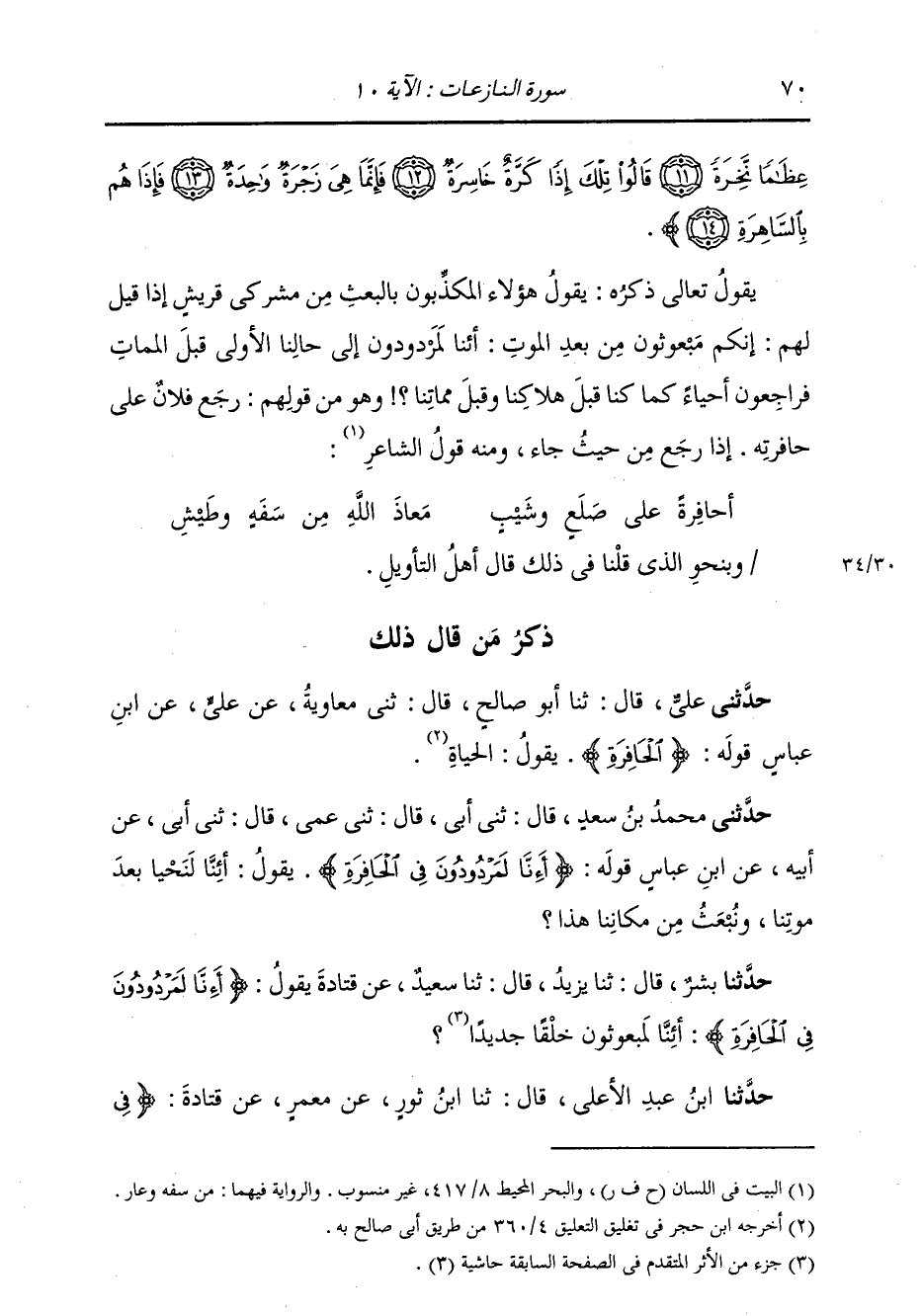 ذِكْرُ مَنْ قَالَ ذَلِكَ: حَدَّثَنِي عَلِيٌّ، قَالَ: ثنا أَبُو صَالِحٍ، قَالَ: ثني مُعَاوِيَةُ، عَنْ عَلِيٍّ، عَنِ ابْنِ عَبَّاسٍ، قَوْلُهُ: {§الْحَافِرَةِ} [النازعات: 10] : يَقُولُ: الْحَيَاةُ