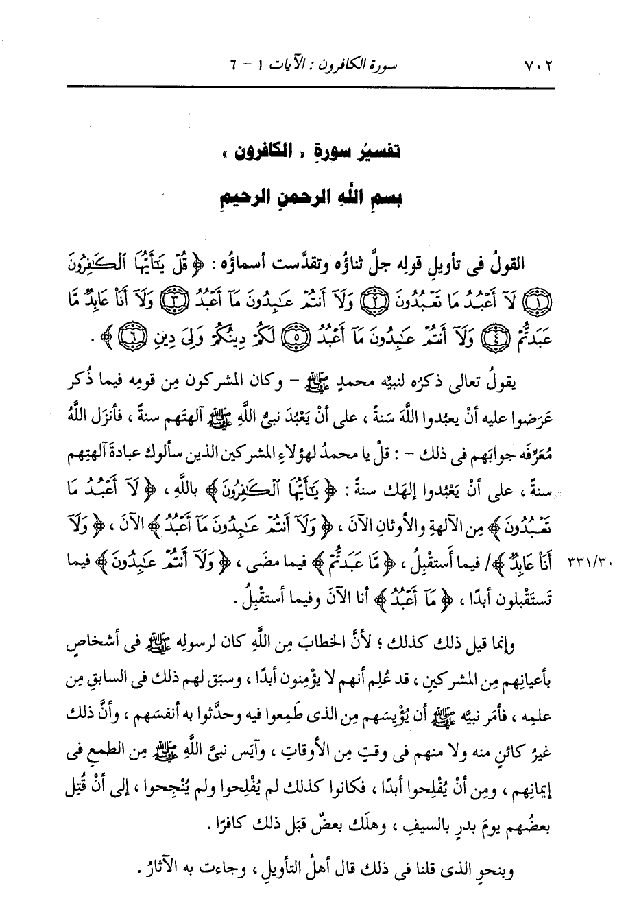 §الْقَوْلُ فِي تَأْوِيلِ قَوْلِهِ تَعَالَى: {قُلْ يَا أَيُّهَا الْكَافِرُونَ لَا أَعْبُدُ مَا تَعْبُدُونَ وَلَا أَنْتُمْ عَابِدُونَ مَا أَعْبُدُ وَلَا أَنَا عَابِدٌ مَا عَبَدتُّمْ وَلَا أَنْتُمْ عَابِدُونَ مَا أَعْبُدُ لَكُمْ دِينُكُمْ وَلِيَ دِينِ} [الكافرون: 2] يَقُولُ تَعَالَى ذِكْرُهُ لِنَبِيِّهِ مُحَمَّدٍ صَلَّى اللهُ عَلَيْهِ وَسَلَّمَ، وَكَانَ الْمُشْرِكُونَ مِنْ قَوْمِهِ فِيمَا ذُكِرَ عَرَضُوا عَلَيْهِ أَنْ يَعْبُدُوا اللَّهَ سَنَةً، عَلَى أَنْ يَعْبُدَ نَبِيُّ اللَّهِ صَلَّى اللهُ عَلَيْهِ وَسَلَّمَ آلِهَتَهُمْ سَنَةً، فَأَنْزَلَ اللَّهُ مَعْرِفَةَ جَوَابِهِمْ فِي ذَلِكَ: {قُلْ} [البقرة: 80] يَا مُحَمَّدُ لِهَؤُلَاءِ الْمُشْرِكِينَ الَّذِينَ سَأَلُوكَ عِبَادَةَ آلِهَتِهِمْ سَنَةً، عَلَى أَنْ يَعْبُدُوا إِلَهَكَ سَنَةً {يَا أَيُّهَا الْكَافِرُونَ} [الكافرون: 1] بِاللَّهِ {لَا أَعْبُدُ مَا تَعْبُدُونَ} [الكافرون: 2] مِنَ الْآلِهَةِ وَالْأَوْثَانِ الْآنَ {وَلَا أَنْتُمْ عَابِدُونَ مَا أَعْبُدُ} [الكافرون: 3] الْآنَ {وَلَا أَنَا عَابِدٌ} [الكافرون: 4] فِيمَا أَسْتَقْبِلُ {مَا عَبَدتُّمْ} [الكافرون: 4] فِيمَا مَضَى {وَلَا أَنْتُمْ عَابِدُونَ} [الكافرون: 3] فِيمَا تَسْتَقْبِلُونَ أَبَدًا {مَا أَعْبُدُ} [الكافرون: 3] أَنَا الْآنَ، وَفِيمَا أَسْتَقْبِلُ. وَإِنَّمَا قِيلَ ذَلِكَ كَذَلِكَ، لِأَنَّ الْخِطَابَ مِنَ اللَّهِ كَانَ لِرَسُولِ اللَّهِ صَلَّى اللهُ عَلَيْهِ وَسَلَّمَ فِي أَشْخَاصٍ بِأَعْيَانِهِمْ مِنَ الْمُشْرِكِينَ، قَدْ عَلِمَ أَنَّهُمْ لَا يُؤْمِنُونَ أَبَدًا، وَسَبَقَ لَهُمْ ذَلِكَ فِي السَّابِقَ مِنْ عِلْمِهِ، فَأَمَرَ نَبِيَّهُ صَلَّى اللهُ عَلَيْهِ وَسَلَّمَ أَنْ يُؤَيِّسَهُمْ مِنَ الَّذِي طَمِعُوا فِيهِ، وَحَدَّثُوا بِهِ أَنْفُسَهُمْ، وَأَنَّ ذَلِكَ غَيْرُ كَائِنٍ مِنْهُ وَلَا مِنْهُمْ، فِي وَقْتٍ مِنَ الْأَوْقَاتِ، وَآيَسَ نَبِيَّ اللَّهِ صَلَّى اللهُ عَلَيْهِ وَسَلَّمَ مِنَ الطَّمَعِ فِي إِيمَانِهِمْ، وَمِنْ أَنْ يُفْلِحُوا أَبَدًا، فَكَانُوا كَذَلِكَ لَمْ يُفْلِحُوا وَلَمْ يَنْجَحُوا، إِلَى أَنْ قُتِلَ بَعْضُهُمْ يَوْمَ بَدْرٍ بِالسَّيْفِ، وَهَلَكَ بَعْضٌ قَبْلَ ذَلِكَ كَافِرًا. وَبِنَحْوِ الَّذِي قُلْنَا فِي ذَلِكَ قَالَ أَهْلُ التَّأْوِيلِ، وَجَاءَتْ بِهِ الْآثَارُ