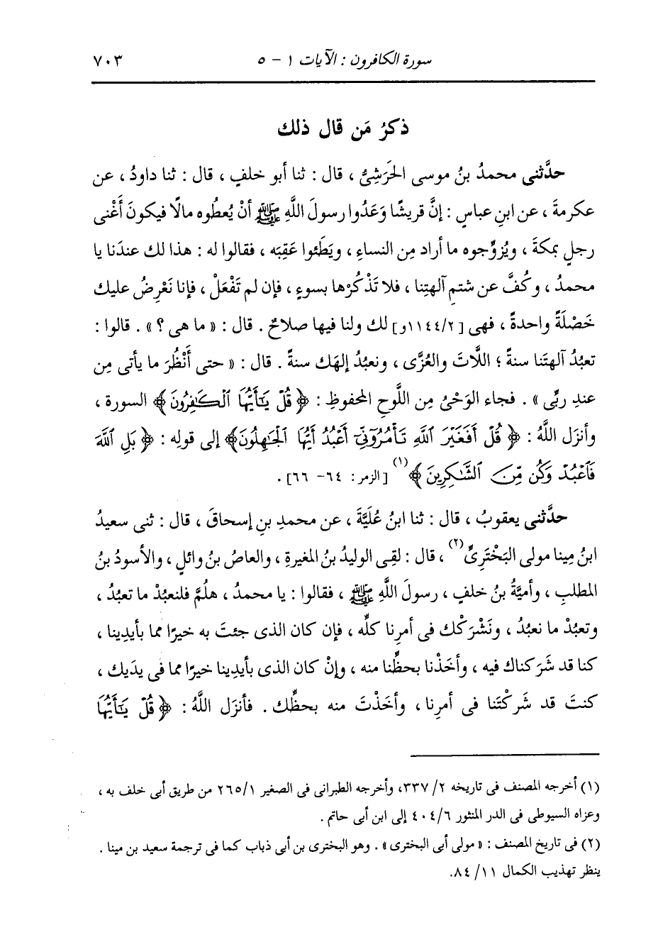 ذِكْرُ مَنْ قَالَ ذَلِكَ حَدَّثَنِي مُحَمَّدُ بْنُ مُوسَى الْحَرَشِيُّ، قَالَ: ثنا أَبُو خَلَفٍ، قَالَ: ثنا دَاوُدُ، عَنْ عِكْرِمَةَ، عَنِ ابْنِ عَبَّاسٍ: " إِنَّ قُرَيْشًا وَعَدُوا رَسُولَ اللَّهِ صَلَّى اللهُ عَلَيْهِ وَسَلَّمَ أَنْ يُعْطُوهُ مَالًا، فَيَكُونَ أَغْنَى رَجُلٍ بِمَكَّةَ، وَيُزَوِّجُوهُ مَا أَرَادَ مِنَ النِّسَاءِ، وَيَطَئُوا عَقِبَهُ، فَقَالُوا لَهُ: هَذَا لَكَ عِنْدَنَا يَا مُحَمَّدُ، وَكُفَّ عَنْ شَتْمِ آلِهَتِنَا، فَلَا تَذْكُرْهَا بِسُوءٍ، فَإِنْ لَمْ تَفْعَلْ، فَإِنَّا نَعْرِضُ عَلَيْكَ خَصْلَةً وَاحِدَةً، فَهِيَ لَكَ وَلَنَا فِيهَا صَلَاحٌ. قَالَ: «مَا هِيَ؟» قَالُوا: §تَعْبُدُ آلِهَتَنَا سَنَةً: اللَّاتَ وَالْعُزَّى، وَنَعْبُدُ إِلَهَكَ سَنَةً، قَالَ: «حَتَّى أَنْظُرَ مَا يَأْتِي مِنْ عِنْدِ رَبِّي» فَجَاءَ الْوَحْيُ مِنَ اللَّوْحِ الْمَحْفُوظِ: قُلْ يَا أَيُّهَا الْكَافِرُونَ السُّورَةُ، وَأَنْزَلَ اللَّهُ: {قُلْ أَفَغَيْرَ اللَّهِ تَأْمُرُونِّي أَعْبُدُ أَيُّهَا الْجَاهِلُونَ} [الزمر: 64] إِلَى قَوْلِهِ: {فَاعْبُدْ وَكُنْ مِنَ الشَّاكِرِينَ} [الزمر: 66] "