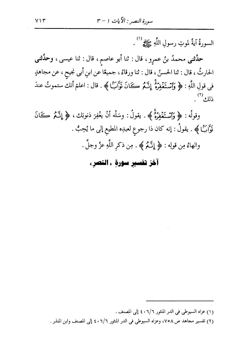 حَدَّثَنِي مُحَمَّدُ بْنُ عَمْرٍو، قَالَ: ثنا أَبُو عَاصِمٍ، قَالَ: ثنا عِيسَى، وَحَدَّثَنِي الْحَارِثُ، قَالَ: ثنا الْحَسَنُ، قَالَ: ثنا وَرْقَاءُ، جَمِيعًا عَنِ ابْنِ أَبِي نَجِيحٍ، عَنْ مُجَاهِدٍ، فِي قَوْلِ اللَّهِ: {§وَاسْتَغْفِرْهُ إِنَّهُ كَانَ تَوَّابًا} [النصر: 3] قَالَ: «اعْلَمْ أَنَّكَ سَتَمُوتُ عِنْدَ ذَلِكَ»