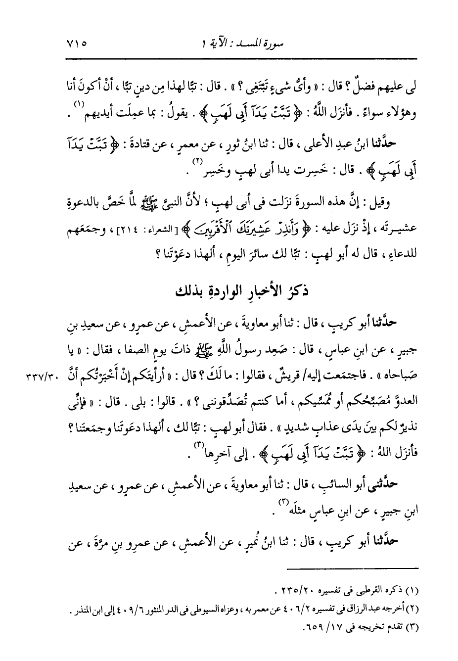 ذِكْرُ الْأَخْبَارِ الْوَارِدَةِ بِذَلِكَ حَدَّثَنَا أَبُو كُرَيْبٍ، قَالَ: ثنا أَبُو مُعَاوِيَةَ، عَنِ الْأَعْمَشِ، عَنْ عَمْرٍو، عَنْ سَعِيدِ بْنِ جُبَيْرٍ، عَنِ ابْنِ عَبَّاسٍ، قَالَ: صَعِدَ رَسُولُ اللَّهِ صَلَّى اللهُ عَلَيْهِ وَسَلَّمَ ذَاتَ يَوْمٍ الصَّفَا، فَقَالَ: «يَا صَبَاحَاهُ» فَاجْتَمَعَتْ إِلَيْهِ قُرَيْشٌ، فَقَالُوا: مَا لَكَ؟ قَالَ: «أَرَأَيْتَكُمْ إِنْ أَخْبَرْتُكُمْ أَنَّ الْعَدُوَّ مُصَبِّحُكُمْ أَوْ مُمَسِّيكُمْ، أَمَا كُنْتُمْ تُصَدِّقُونَنِي؟» قَالُوا: بَلَى، قَالَ: «فَإِنِّي نَذِيرٌ لَكُمْ بَيْنَ يَدَيْ عَذَابٍ شَدِيدٍ» فَقَالَ أَبُو لَهَبٍ: §تَبًّا لَكَ، أَلِهَذَا دَعَوْتَنَا وَجَمَعْتَنَا؟ فَأَنْزَلَ اللَّهُ: تَبَّتْ يَدَا أَبِي لَهَبٍ إِلَى آخِرِهَا " حَدَّثَنِي أَبُو السَّائِبِ، قَالَ: ثنا أَبُو مُعَاوِيَةَ، عَنِ الْأَعْمَشِ، عَنْ عَمْرٍو، عَنْ سَعِيدِ بْنِ جُبَيْرٍ، عَنِ ابْنِ عَبَّاسٍ، مِثْلَهُ