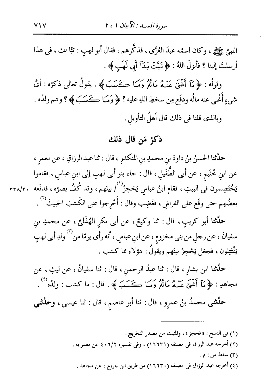حَدَّثَنِي مُحَمَّدُ بْنُ عَمْرٍو، قَالَ: ثنا أَبُو عَاصِمٍ، قَالَ: ثنا عِيسَى؛ وَحَدَّثَنِي -[718]- الْحَارِثُ، قَالَ: ثنا الْحَسَنُ، قَالَ: ثنا وَرْقَاءُ، جَمِيعًا عَنِ ابْنِ أَبِي نَجِيحٍ، عَنْ مُجَاهِدٍ، فِي قَوْلِ اللَّهِ: " {§وَمَا كَسَبَ} [المسد: 2] قَالَ: وَلَدُهُ هُمْ مِنْ كَسْبِهِ "