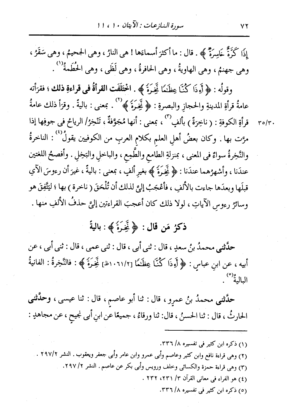 §وَقَوْلُهُ: {أَئِذَا كُنَّا عِظَامًا نَخِرَةً} [النازعات: 11] اخْتَلَفَتِ الْقُرَّاءُ فِي قِرَاءَةِ ذَلِكَ، فَقَرَأَتْهُ عَامَّةُ قُرَّاءِ الْمَدِينَةِ وَالْحِجَازِ وَالْبَصْرَةِ {نَخِرَةً} [النازعات: 11] بِمَعْنَى: بَالِيَةً. وَقَرَأَ ذَلِكَ عَامَّةُ قُرَّاءِ الْكُوفَةِ: (نَاخِرَةً) بِأَلِفٍ، بِمَعْنَى: أَنَّهَا مُجَوَّفَةٌ، تَنْخَرُ الرِّيَاحُ فِي جَوْفِهَا إِذَا مَرَّتْ بِهَا. وَكَانَ بَعْضُ أَهْلِ الْعِلْمِ بِكَلَامِ الْعَرَبِ مِنَ الْكُوفِيِّينَ يَقُولُ: النَّاخِرَةُ وَالنَّخِرَةُ: سَوَاءٌ فِي الْمَعْنَى، بِمَنْزِلَةِ الطَّامِعِ وَالطَّمِعِ، وَالْبَاخِلِ وَالْبَخِلِ؛ وَأَفْصَحُ اللُّغَتَيْنِ عِنْدَنَا وَأَشْهَرُهُمَا عِنْدَنَا {نَخِرَةً} [النازعات: 11] ، بِغَيْرِ أَلِفٍ، بِمَعْنَى: بَالِيَةً، غَيْرَ أَنَّ رُءُوسَ الْآيِ قَبْلَهَا وَبَعْدَهَا جَاءَتْ بِالْأَلِفِ. فَأَعْجَبُ إِلَيَّ لِذَلِكَ أَنْ تَلْحَقَ نَاخِرَةٌ بِهَا، لِيَتَّفِقَ هُوَ وَسَائِرُ رُءُوسِ الْآيَاتِ، لَوْلَا ذَلِكَ كَانَ أَعْجَبُ الْقِرَاءَتَيْنِ إِلَيَّ حَذْفَ الْأَلِفِ مِنْهَا