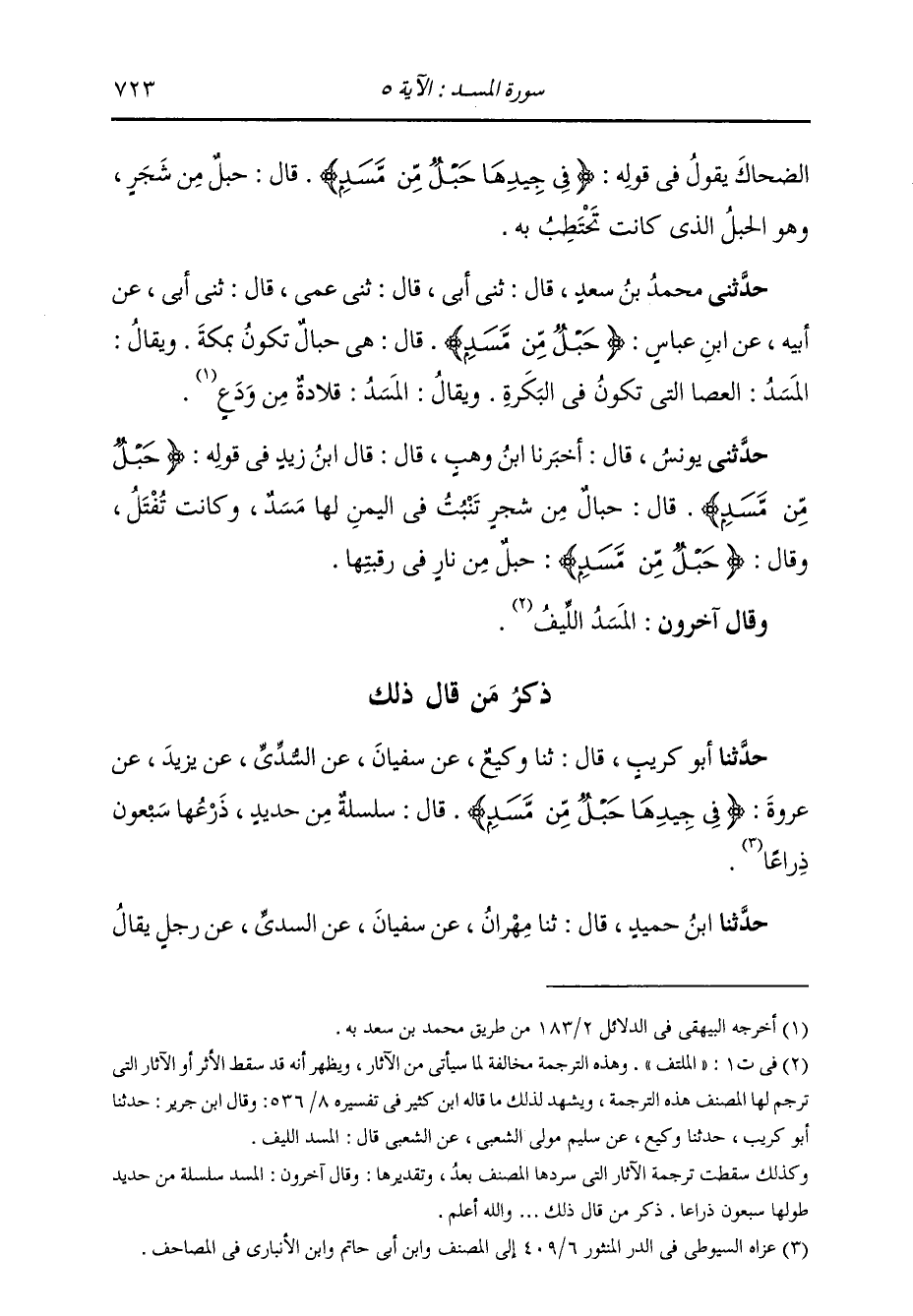 حَدَّثَنِي مُحَمَّدُ بْنُ سَعْدٍ، قَالَ: ثني أَبِي، قَالَ: ثني عَمِّي، قَالَ: ثني أَبِي، عَنْ أَبِيهِ، عَنِ ابْنِ عَبَّاسٍ، {§حَبْلٌ مِنْ مَسَدٍ} [المسد: 5] قَالَ: " هِيَ حِبَالٌ تَكُونُ بِمَكَّةَ؛ وَيُقَالُ: الْمَسَدُ: الْعَصَا الَّتِي تَكُونُ فِي الْبَكْرَةِ، وَيُقَالُ الْمَسَدُ: قِلَادَةٌ مِنْ وَدَعٍ "