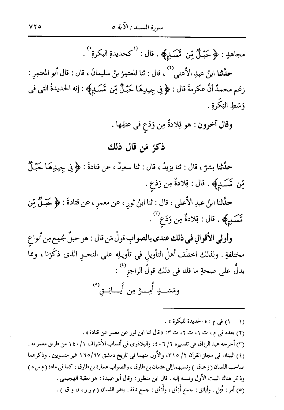 حَدَّثَنَا ابْنُ عَبْدِ الْأَعْلَى، قَالَ: ثنا ابْنُ ثَوْرٍ، عَنْ مَعْمَرٍ، عَنْ قَتَادَةَ: " {§حَبْلٌ مِنْ مَسَدٍ} [المسد: 5] قَالَ: «قِلَادَةٌ مِنْ وَدَعٍ» وَأَوْلَى الْأَقْوَالِ فِي ذَلِكَ عِنْدِي بِالصَّوَابِ، قَوْلُ مَنْ قَالَ: هُوَ حَبْلٌ جُمِعَ مِنْ أَنْوَاعٍ مُخْتَلِفَةٍ، وَلِذَلِكَ اخْتَلَفَ أَهْلُ التَّأْوِيلِ فِي تَأْوِيلِهِ عَلَى النَّحْوِ الَّذِي ذَكَرْنَا، وَمِمَّا يَدُلُّ عَلَى صِحَّةِ مَا قُلْنَا فِي ذَلِكَ قَوْلُ الرَّاجِزِ: