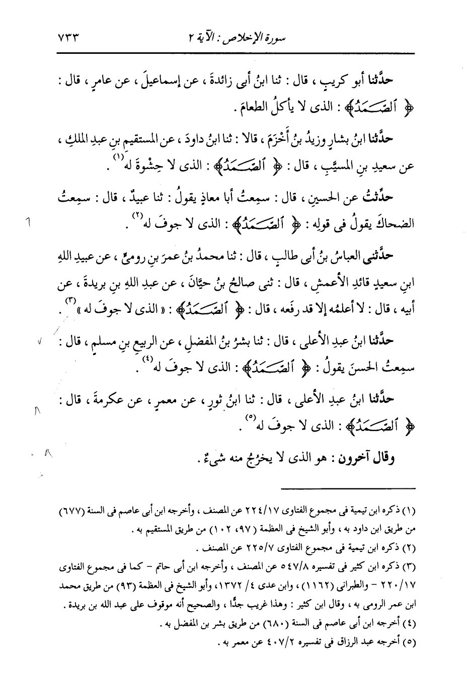 حَدَّثَنَا ابْنُ بَشَّارٍ، وَزَيْدُ بْنُ أَخْزَمَ، قَالَا: ثنا ابْنُ دَاوُدَ، عَنِ الْمُسْتَقِيمِ بْنِ عَبْدِ الْمَلِكِ، عَنْ سَعِيدِ بْنِ الْمُسَيِّبِ، قَالَ: {§الصَّمَدُ} [الإخلاص: 2] : «الَّذِي لَا حِشْوَةَ لَهُ»