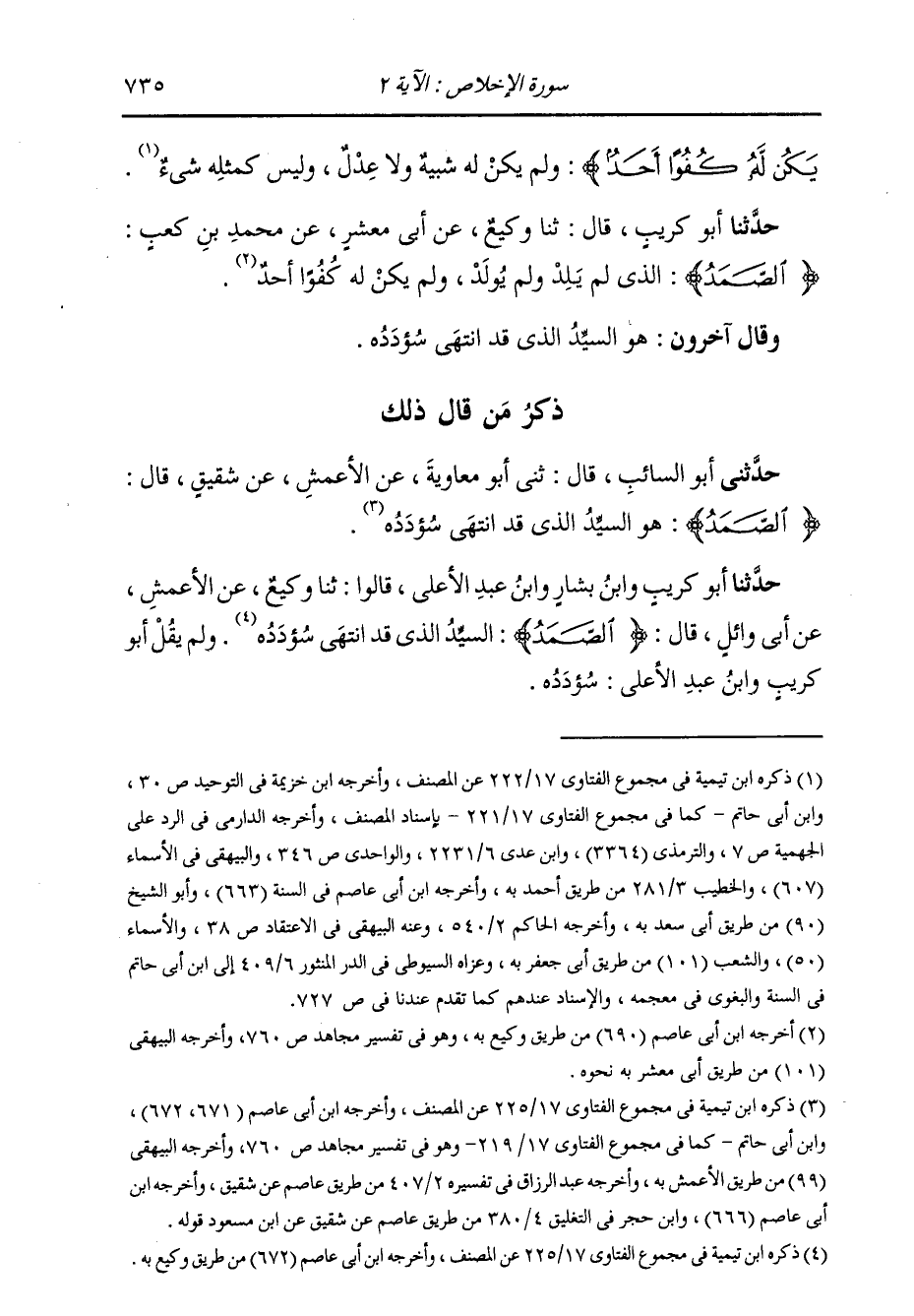 حَدَّثَنَا أَبُو كُرَيْبٍ، وَابْنُ بَشَّارٍ، وَابْنُ عَبْدِ الْأَعْلَى، قَالُوا: ثنا وَكِيعٌ، عَنِ الْأَعْمَشِ، عَنْ أَبِي وَائِلٍ، قَالَ: §الصَّمَدُ: «السَّيِّدُ الَّذِي قَدِ انْتَهَى سُؤْدَدُهُ» وَلَمْ يَقُلْ أَبُو كُرَيْبٍ وَابْنُ عَبْدِ الْأَعْلَى سُؤْدَدُهُ -[736]- حَدَّثَنَا ابْنُ حُمَيْدٍ، قَالَ: ثنا مِهْرَانُ، عَنْ سُفْيَانَ، عَنِ الْأَعْمَشِ، عَنْ أَبِي وَائِلٍ مِثْلَهُ