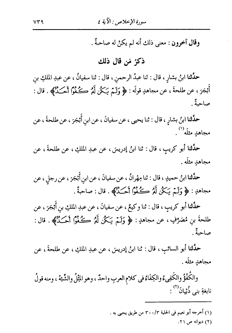 حَدَّثَنَا أَبُو كُرَيْبٍ، قَالَ: ثنا وَكِيعٌ، عَنْ سُفْيَانَ، عَنْ عَبْدِ الْمَلِكِ بْنِ أَبْجَرَ، عَنْ طَلْحَةَ بْنِ مُصَرِّفٍ، عَنْ مُجَاهِدٍ: {§وَلَمْ يَكُنْ لَهُ كُفُوًا أَحَدٌ} [الإخلاص: 4] قَالَ: «صَاحِبَةٌ» حَدَّثَنَا أَبُو السَّائِبِ، قَالَ: ثنا ابْنُ إِدْرِيسَ، عَنْ عَبْدِ الْمَلِكِ، عَنْ طَلْحَةَ، عَنْ مُجَاهِدٍ مِثْلَهُ وَالْكُفْؤُ وَالْكَفِيءُ وَالْكِفَاءُ فِي كَلَامِ الْعَرَبِ وَاحِدٌ، وَهُوَ الْمَثَلُ وَالشَّبَهُ؛ وَمِنْهُ قَوْلُ نَابِغَةِ بَنِي ذُبْيَانَ:
