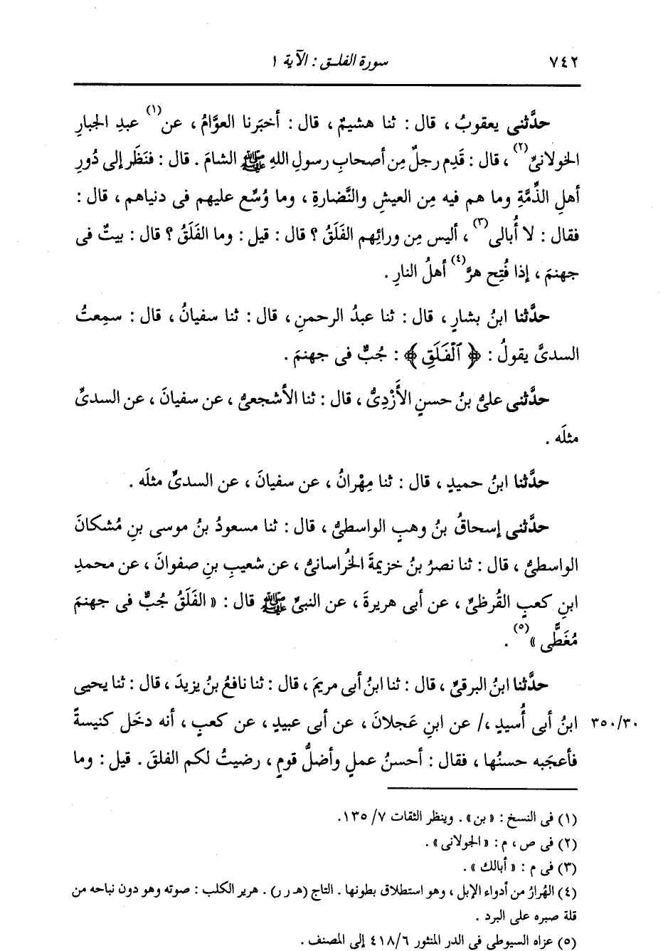 حَدَّثَنَا ابْنُ بَشَّارٍ، قَالَ: ثنا عَبْدُ الرَّحْمَنِ، قَالَ: ثنا سُفْيَانُ، قَالَ: سَمِعْتُ السُّدِّيَّ، يَقُولُ: {§الْفَلَقُ} [الفلق: 1] : «جُبٌّ فِي جَهَنَّمَ» حَدَّثَنِي عَلِيُّ بْنُ حَسَنٍ الْأَزْدِيُّ، قَالَ: ثنا الْأَشْجَعِيُّ، عَنْ سُفْيَانَ، عَنِ السُّدِّيِّ، مِثْلَهُ. حَدَّثَنَا ابْنُ حُمَيْدٍ، قَالَ: ثنا مِهْرَانُ، عَنْ سُفْيَانَ، عَنِ السُّدِّيِّ، مِثْلَهُ