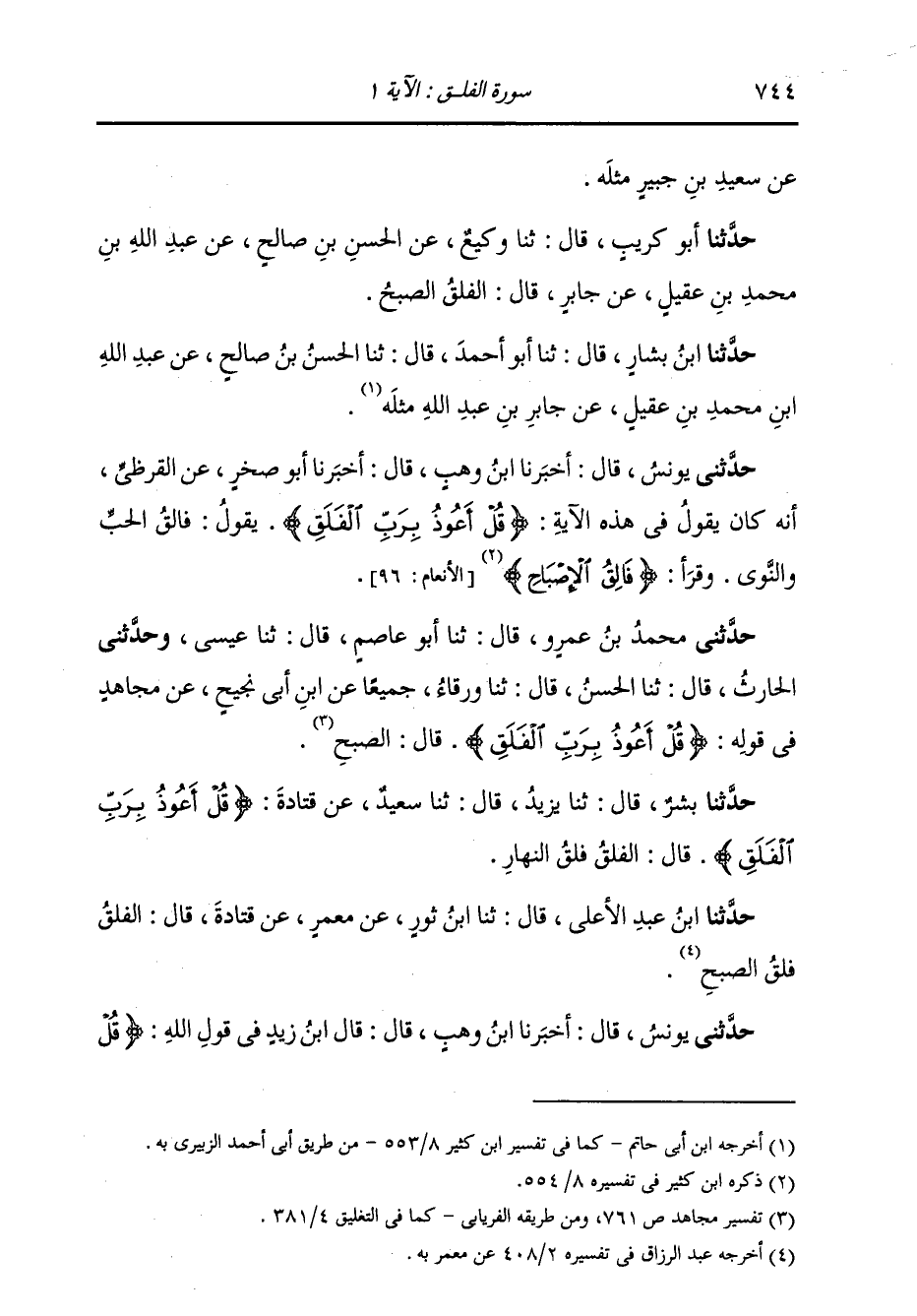 حَدَّثَنَا أَبُو كُرَيْبٍ، قَالَ: ثنا وَكِيعٌ، عَنِ الْحَسَنِ بْنِ صَالِحٍ، عَنْ عَبْدِ اللَّهِ بْنِ مُحَمَّدِ بْنِ عَقِيلٍ، عَنْ جَابِرٍ، قَالَ: §الْفَلَقُ: «الصُّبْحُ» حَدَّثَنَا ابْنُ بَشَّارٍ، قَالَ: ثنا أَبُو أَحْمَدَ، قَالَ: ثنا الْحَسَنُ بْنُ صَالِحٍ، عَنْ عَبْدِ اللَّهِ بْنِ مُحَمَّدِ بْنِ عَقِيلٍ، عَنْ جَابِرِ بْنِ عَبْدِ اللَّهِ، مِثْلَهُ