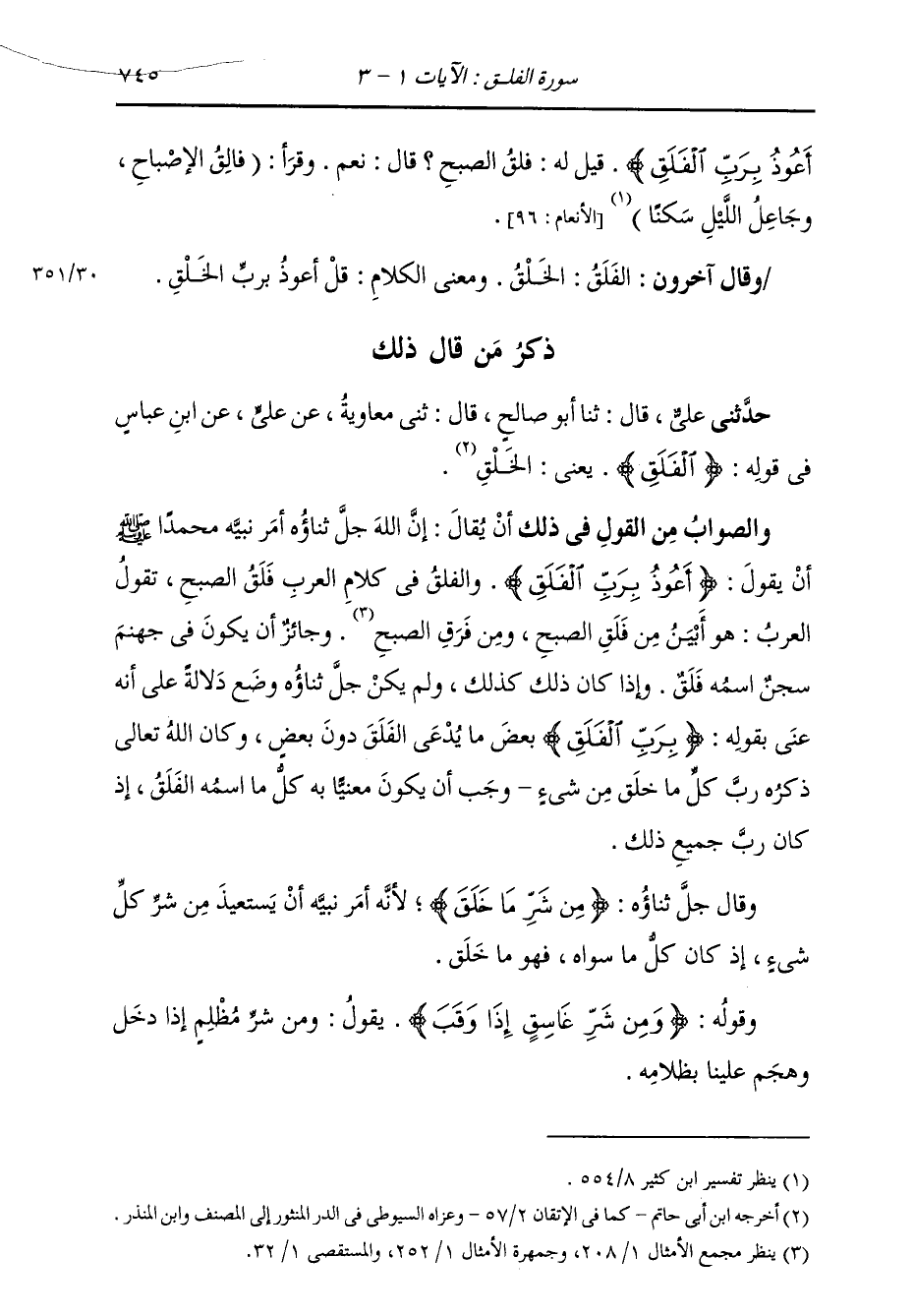 ذِكْرُ مَنْ قَالَ ذَلِكَ حَدَّثَنِي عَلِيٌّ، قَالَ ثنا أَبُو صَالِحٍ، قَالَ: ثني مُعَاوِيَةُ، عَنْ عَلِيٍّ، عَنِ ابْنِ عَبَّاسٍ، فِي قَوْلِهِ: {§الْفَلَقِ} [الفلق: 1] : «يَعْنِي الْخَلْقَ» وَالصَّوَابُ مِنَ الْقَوْلِ فِي ذَلِكَ، أَنْ يُقَالَ: إِنَّ اللَّهَ جَلَّ ثَنَاؤُهُ أَمَرَ نَبِيَّهُ مُحَمَّدًا صَلَّى اللهُ عَلَيْهِ وَسَلَّمَ أَنْ يَقُولَ: {أَعُوذُ بِرَبِّ الْفَلَقِ} [الفلق: 1] وَالْفَلَقُ فِي كَلَامِ الْعَرَبِ: فَلَقُ الصُّبْحِ، تَقُولُ الْعَرَبُ: هُوَ أَبْيَنُ مِنْ فَلَقِ الصُّبْحِ، وَمِنْ فَرَقِ الصُّبْحِ. وَجَائِزٌ أَنْ يَكُونَ فِي جَهَنَّمَ سِجْنٌ اسْمُهُ فَلَقٌ. وَإِذَا كَانَ ذَلِكَ كَذَلِكَ، وَلَمْ يَكُنْ جَلَّ ثَنَاؤُهُ وَضَعَ دَلَالَةً عَلَى أَنَّهُ عُنِيَ بِقَوْلِهِ {بِرَبِّ الْفَلَقِ} [الفلق: 1] بَعْضُ مَا يُدْعَى الْفَلَقُ دُونَ بَعْضٍ، وَكَانَ اللَّهُ تَعَالَى ذِكْرُهُ رَبَّ كُلِّ مَا خَلَقَ مِنْ شَيْءٍ، وَجَبَ أَنْ يَكُونَ مَعْنِيًّا بِهِ كُلُّ مَا اسْمُهُ الْفَلَقُ، إِذْ كَانَ رَبَّ جَمِيعِ ذَلِكَ وَقَالَ جَلَّ ثَنَاءُهُ {مِنْ شَرِّ مَا خَلَقَ} [الفلق: 2] لِأَنَّهُ أَمَرَ نَبِيَّهُ أَنْ يَسْتَعِيذَ مِنْ شَرِّ كُلِّ شَيْءٍ، إِذَا كَانَ كُلُّ مَا سِوَاهُ، فَهُوَ مَا خَلَقَ