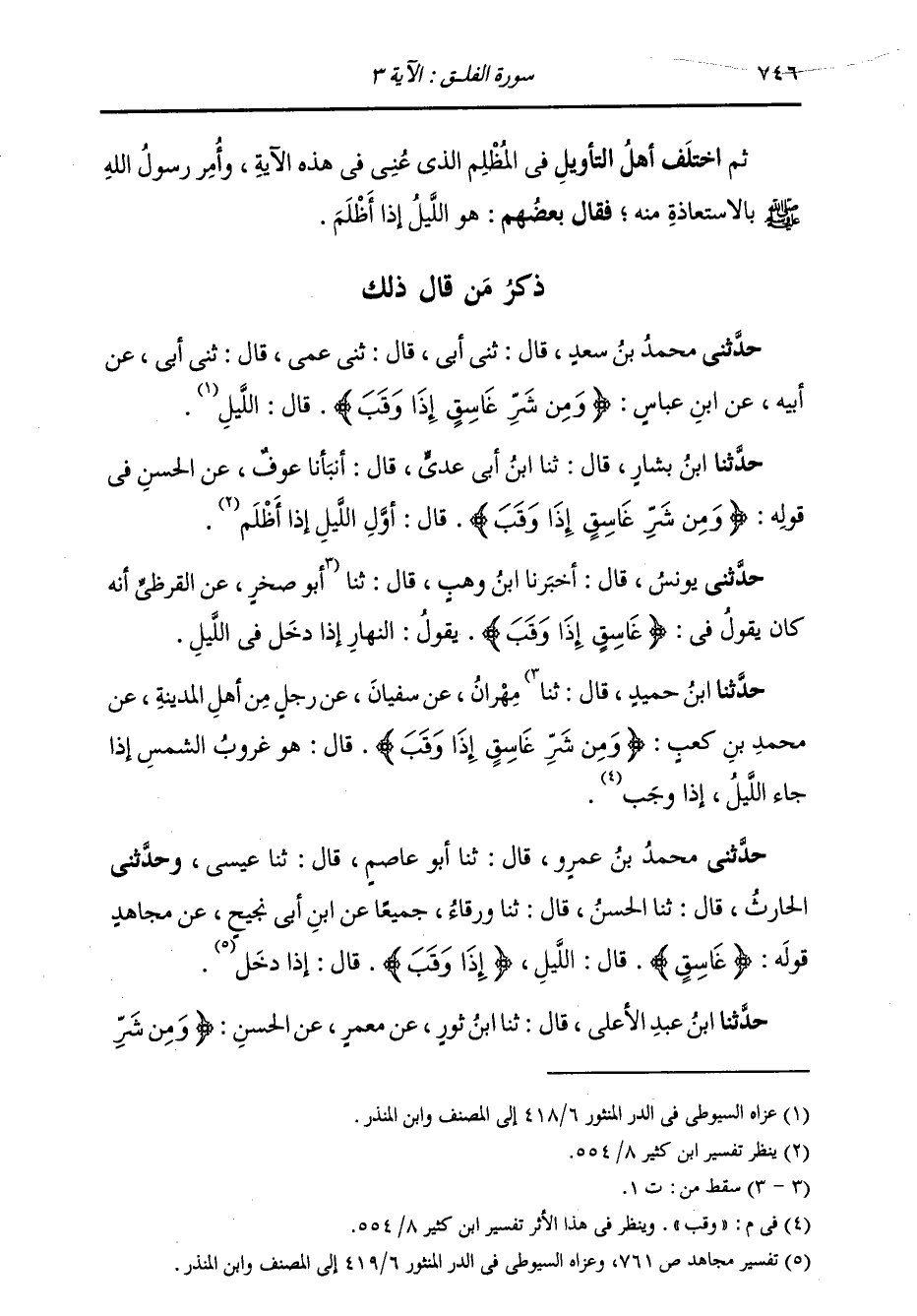ذِكْرُ مَنْ قَالَ ذَلِكَ حَدَّثَنِي مُحَمَّدُ بْنُ سَعْدٍ، قَالَ: ثني أَبِي، قَالَ: ثني عَمِّي، قَالَ: ثني أَبِي، عَنْ أَبِيهِ، عَنِ ابْنِ عَبَّاسٍ {§وَمِنْ شَرِّ غَاسِقٍ إِذَا وَقَبَ} [الفلق: 3] قَالَ: «اللَّيْلُ»