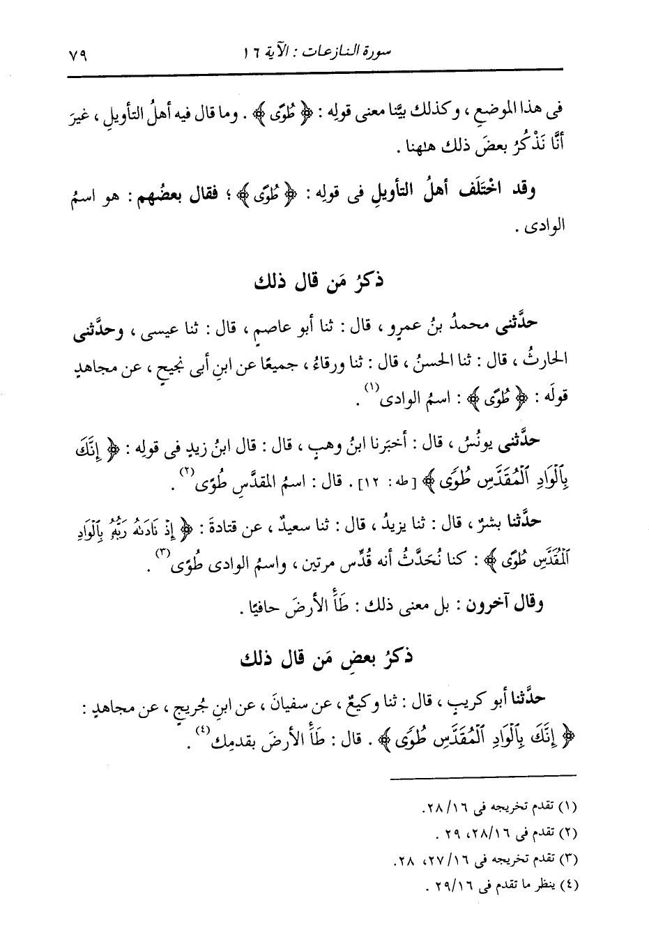 ذِكْرُ مَنْ قَالَ ذَلِكَ: حَدَّثَنِي مُحَمَّدُ بْنُ عَمْرٍو، قَالَ: ثنا أَبُو عَاصِمٍ، قَالَ: ثنا عِيسَى، وَحَدَّثَنِي الْحَارِثُ، قَالَ: ثنا الْحَسَنُ، قَالَ: ثنا وَرْقَاءُ، جَمِيعًا عَنِ ابْنِ أَبِي نَجِيحٍ، عَنْ مُجَاهِدٍ، قَوْلُهُ: {§طُوًى} [النازعات: 16] اسْمُ الْوَادِي