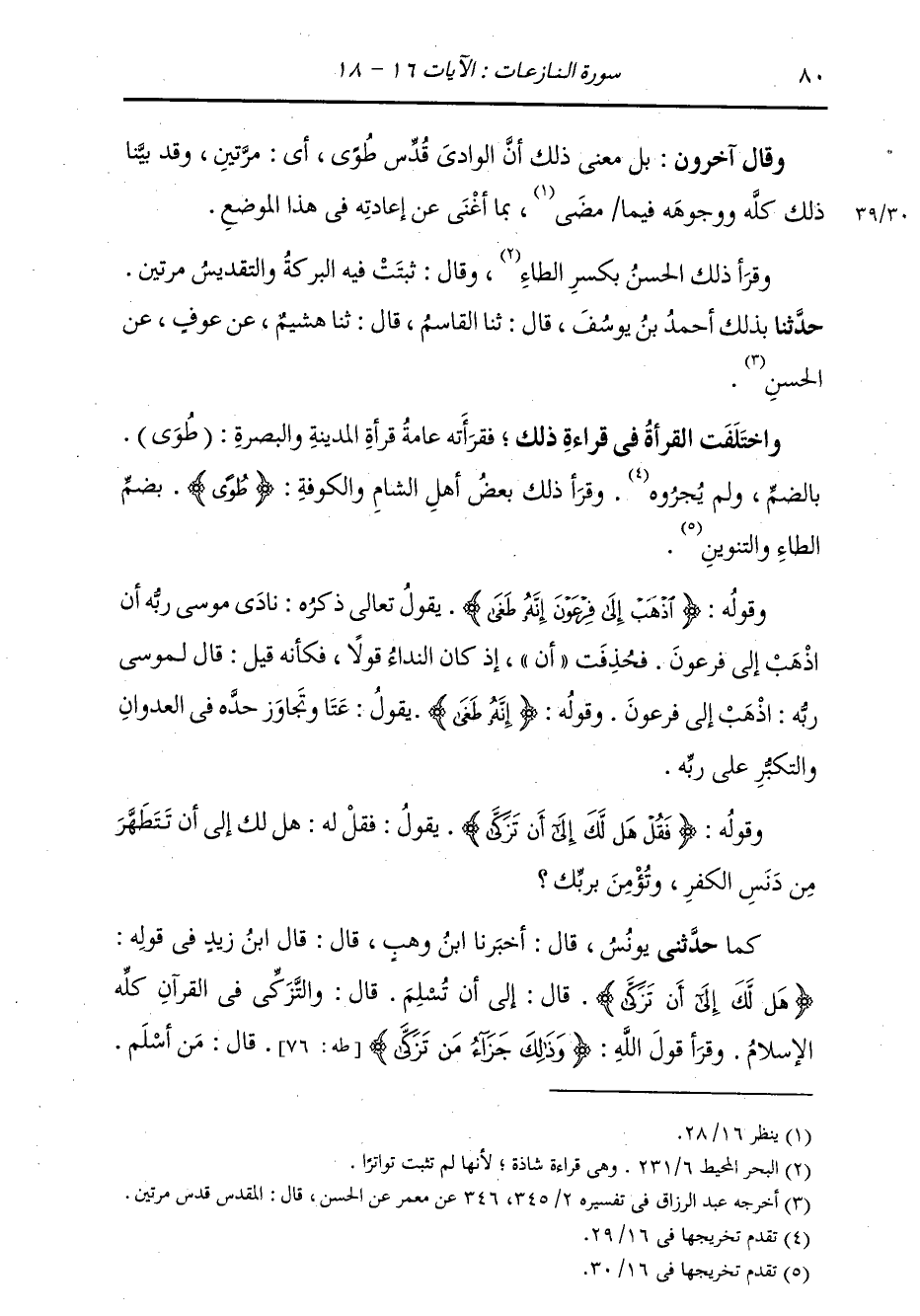 وَقَرَأَ ذَلِكَ الْحَسَنُ بِكَسْرِ الطَّاءِ، وَقَالَ: §بُثَّتْ فِيهِ الْبَرَكَةُ وَالتَّقْدِيسُ مَرَّتَيْنِ حَدَّثَنَا بِذَلِكَ، أَحْمَدُ بْنُ يُوسُفَ، قَالَ: ثنا الْقَاسِمُ، قَالَ: ثنا هُشَيْمٌ، عَنْ عَوْفٍ، عَنِ الْحَسَنِ وَاخْتَلَفَتِ الْقُرَّاءُ فِي قِرَاءَةِ ذَلِكَ، فَقَرَأَتْهُ عَامَّةُ قُرَّاءِ الْمَدِينَةِ وَالْبَصْرَةِ (طُوَى) بِالضَّمِّ وَلَمْ يُجْرُوهُ؛ وَقَرَأَ ذَلِكَ بَعْضُ أَهْلِ الشَّأْمِ وَالْكُوفَةِ {طُوًى} [النازعات: 16] بِضَمِّ الطَّاءِ وَالتَّنْوِينِ