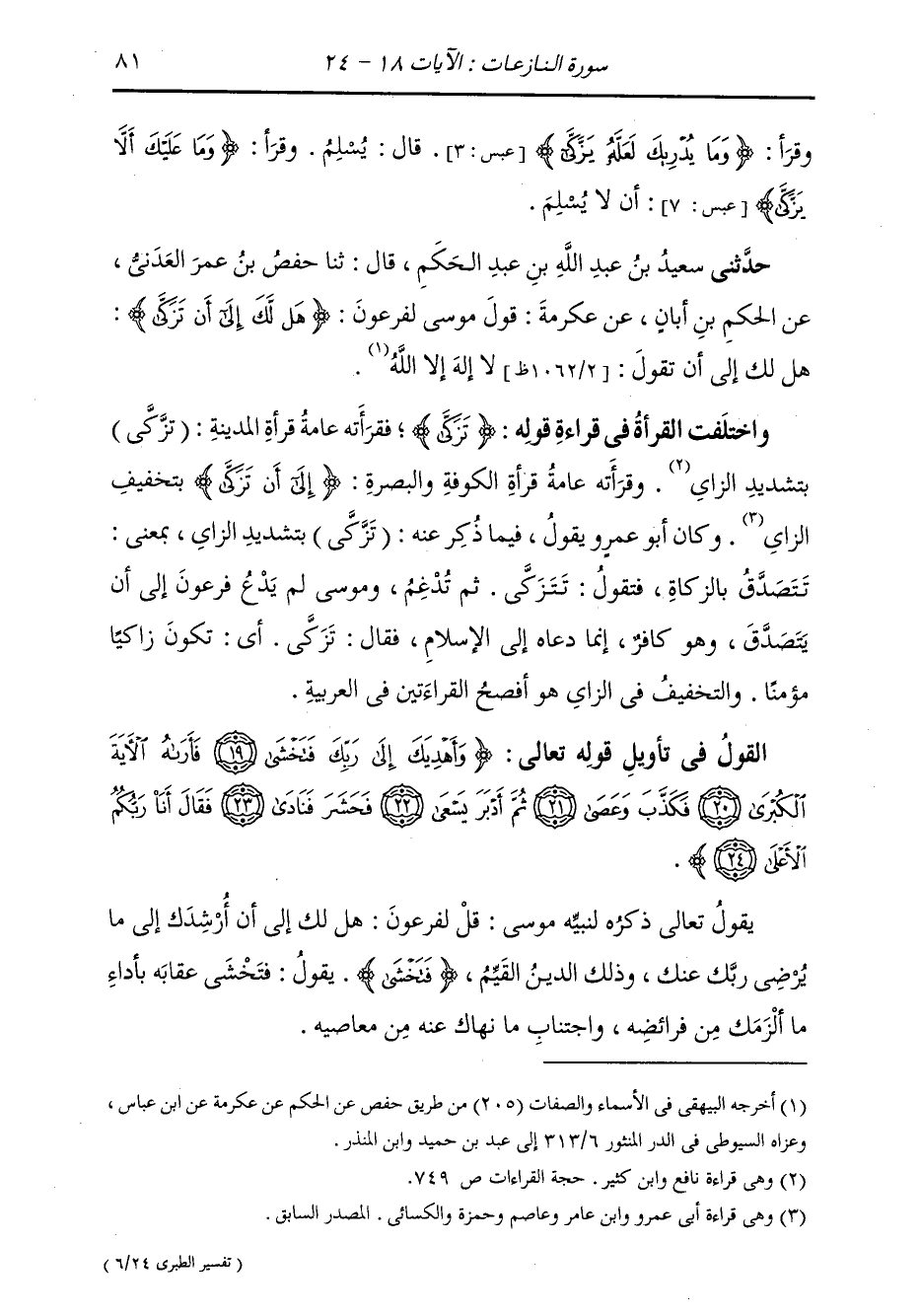 حَدَّثَنِي سَعِيدُ بْنُ عَبْدِ اللَّهِ بْنِ عَبْدِ الْحَكَمِ، قَالَ: ثنا حَفْصُ بْنُ عُمَرَ الْعَدَنِيُّ، عَنِ الْحَكِيمِ بْنِ أَبَانَ، عَنْ عِكْرِمَةَ، قَوْلَ مُوسَى لِفِرْعَوْنَ: {هَلْ لَكَ إِلَى §أَنْ تَزَكَّى} [النازعات: 18] هَلْ لَكَ إِلَى أَنْ تَقُولَ لَا إِلَهَ إِلَّا اللَّهُ وَاخْتَلَفَتِ الْقُرَّاءُ فِي قِرَاءَةِ قَوْلِهِ: {تَزَكَّى} [النازعات: 18] فَقَرَأَتْهُ عَامَّةُ قُرَّاءِ الْمَدِينَةِ: (تَزَّكَّى) بِتَشْدِيدِ الزَّايِ، وَقَرَأَتْهُ عَامَّةُ قُرَّاءِ الْكُوفَةِ وَالْبَصْرَةِ: إِلَى أَنْ {تَزَكَّى} [طه: 76] بِتَخْفِيفِ الزَّايِ. وَكَانَ أَبُو عَمْرٍو يَقُولُ، فِيمَا ذُكِرَ عَنْهُ: (تَزَّكَّى) بِتَشْدِيدِ الزَّايِ، بِمَعْنَى: تَتَصَدَّقُ بِالزَّكَاةِ، فَتَقُولُ: تَتَزَكَّى، ثُمَّ تُدْغِمُ؛ وَمُوسَى لَمْ يَدْعُ فِرْعَوْنَ إِلَى أَنْ يَتَصَدَّقَ وَهُوَ كَافِرٌ، إِنَّمَا دَعَاهُ إِلَى الْإِسْلَامِ، فَقَالَ: تَزَكَّى: أَيْ تَكُونُ زَاكِيًا مُؤْمِنًا، وَالتَّخْفِيفُ فِي الزَّايِ هُوَ أَفْصَحُ الْقِرَاءَتَيْنِ فِي الْعَرَبِيَّةِ