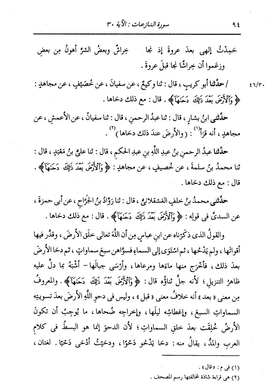 حَدَّثَنِي مُحَمَّدُ بْنُ خَلَفٍ الْعَسْقَلَانِيُّ، قَالَ: ثنا رَوَّادُ بْنُ الْجَرَّاحِ، عَنْ أَبِي حَمْزَةَ، عَنِ السُّدِّيِّ، فِي قَوْلِهِ: {§وَالْأَرْضَ بَعْدَ ذَلِكَ دَحَاهَا} [النازعات: 30] قَالَ: مَعَ ذَلِكَ دَحَاهَا وَالْقَوْلُ الَّذِي ذَكَرْنَاهُ عَنِ ابْنِ عَبَّاسٍ مِنْ أَنَّ اللَّهَ تَعَالَى خَلَقَ الْأَرْضَ، وَقَدَّرَ فِيهَا أَقْوَاتَهَا، وَلَمْ يَدْحُهَا، ثُمَّ اسْتَوَى إِلَى السَّمَاءِ فَسَوَّاهُنَّ سَبْعَ سَمَوَاتٍ، ثُمَّ دَحَا الْأَرْضَ بَعْدَ ذَلِكَ، فَأَخْرَجَ مِنْهَا مَاءَهَا وَمَرْعَاهَا، وَأَرْسَى جِبَالَهَا، أَشْبَهُ لِمَا دَلَّ عَلَيْهِ ظَاهَرُ التَّنْزِيلِ، لِأَنَّهُ جَلَّ ثَنَاؤُهُ قَالَ: {وَالْأَرْضَ بَعْدَ ذَلِكَ دَحَاهَا} [النازعات: 30] وَالْمَعْرُوفُ مِنْ مَعْنَى بَعْدُ أَنَّهُ خِلَافُ مَعْنَى قَبْلُ وَلَيْسَ فِي دَحْوِ اللَّهِ الْأَرْضَ بَعْدَ تَسْوِيَتِهِ السَّمَاوَاتِ السَّبْعَ، وَإِغْطَاشِهِ لَيْلَهَا، وَإِخْرَاجِهِ ضُحَاهَا، مَا يُوجِبُ أَنْ تَكُونَ الْأَرْضُ خُلِقَتْ بَعْدَ خَلْقِ السَّمَاوَاتِ لِأَنَّ الدَّحْوَ إِنَّمَا هُوَ الْبَسْطُ فِي كَلَامِ الْعَرَبِ، وَالْمَدُّ يُقَالُ مِنْهُ: دَحَا يَدْحُو دَحْوًا، وَدَحَيْتُ أُدْحِي دَحْيًا لُغَتَانِ؛