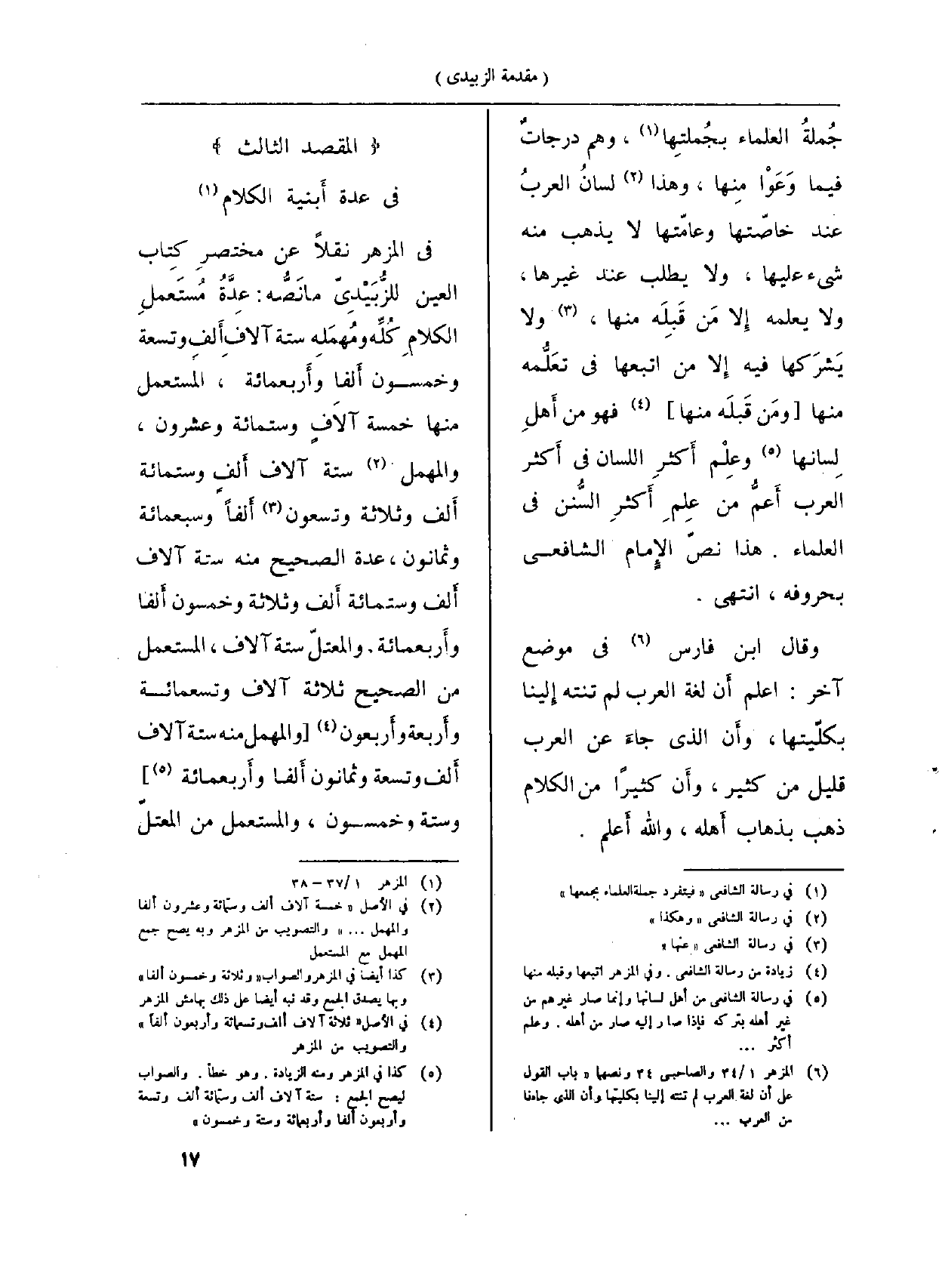 فِي المزهر نقلا عَن مختصرِ كِتاب الْعين للزُّبَيْدِيّ مَا نَصُّه: عِدَّةُ مُستَعملِ الكلامِ كُلِّه ومُهمَلِه سِتَّة آلافِ أَلفِ وَتِسْعَة وَخَمْسُونَ ألفا وَأَرْبَعمِائَة، الْمُسْتَعْمل مِنْهَا خَمْسَة آلافٍ وسِتمِائَة وَعِشْرُونَ، والمهمل سِتَّة آلَاف ألفٍ وسِتمِائَة ألف وَثَلَاثَة وَتسْعُونَ ألفا وَسَبْعمائة وَثَمَانُونَ، عدَّة الصَّحِيح مِنْهُ سِتَّة آلَاف ألف وسِتمِائَة ألف وَثَلَاثَة وَخَمْسُونَ ألفا وَأَرْبَعمِائَة. والمعتلّ سِتَّة آلَاف، الْمُسْتَعْمل من الصَّحِيح ثَلَاثَة آلَاف وَتِسْعمِائَة وَأَرْبَعَة وَأَرْبَعُونَ [والمهمل مِنْهُ سِتَّة آلَاف ألف وَتِسْعَة وَثَمَانُونَ ألفا وَأَرْبَعمِائَة] وَسِتَّة وَخَمْسُونَ، والمستعمل من المعتلّ