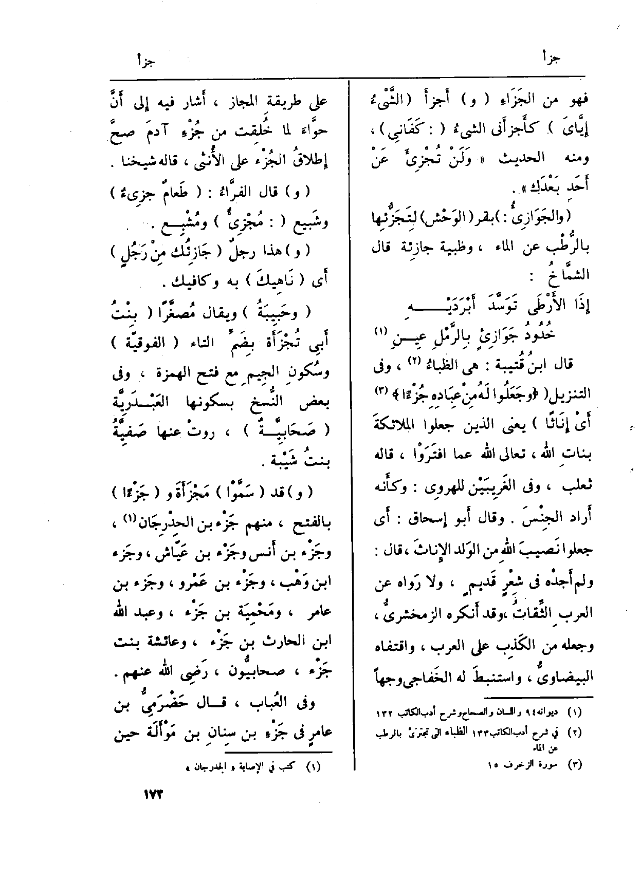 قَالَ ابنُ قُتيبة: هِيَ الظباءُ، وَفِي التَّنْزِيل ( {1. 013 وَجعلُوا لَهُ من عباده {جُزْءا} (الزخرف: 15) أَيْ إِنَاثاً) يَعْنِي الَّذين جعلُوا الملائكةَ بناتِ الله، تَعَالَى الله عَمَّا افتَرَوْا، قَالَه ثَعْلَب، وَفِي الغَريِبَيْن للهروِي: وكأَنه أَراد الجِنْسَ. وَقَالَ أَبو إِسحاق: أَي جعلُوا نَصيبَ اللَّهِ من الوَلد الإِناثَ، قَالَ: وَلم أَجدْه فِي شِعْرٍ قَديمٍ، وَلَا رَواه عَن العربِ الثِّقاتُ، وَقد أَنكره الزمخشريُّ، وَجعله من الكَذِب على الْعَرَب، واقتفاه البيضاويُّ، واستنبطَ لَهُ الخَفاجي وَجها على طريقةِ الْمجَاز، أَشار فِيهِ إِلى أَنَّ حوَّاءَ لما خُلِقت من جُزْءِ آدمَ صحَّ إِصلاقُ الجُزْء على الأُنثى، قَالَه شَيخنَا.