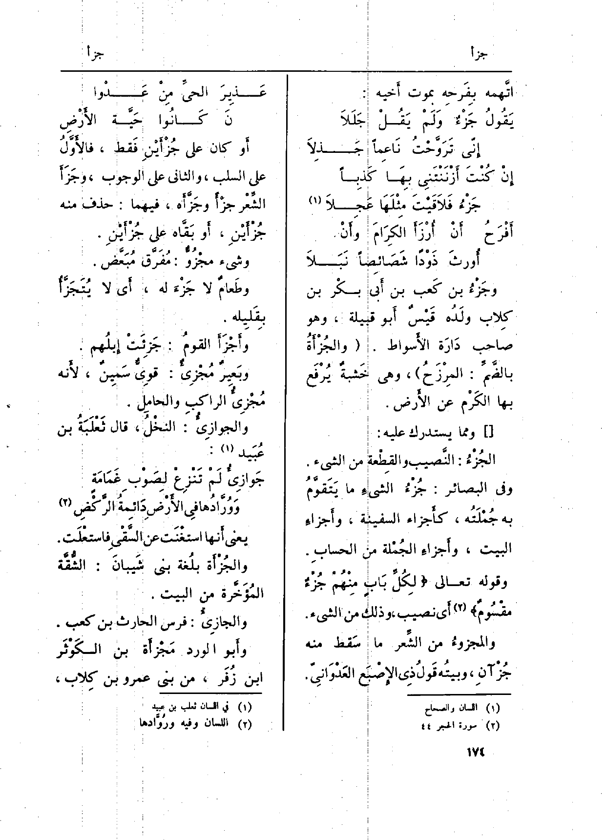 } الجُزْءُ: النَّصيب والقِطْعة من الشَّيْء. وَفِي البصائر: جُزْءُ الشيءِ مَا يَتَقوَّمُ بِهِ جُمْلَتُه، كأَجزاء السَّفِينَة، وأَجزاءِ الْبَيْت، وأَجزاءِ الجُمْلة من الحسابِ. وَقَوله تَعَالَى: {لِكُلّ بَابٍ مّنْهُمْ جُزْء مَّقْسُومٌ} (الْحجر: 44) أَي نصيب، وَذَلِكَ من الشَّيْء.