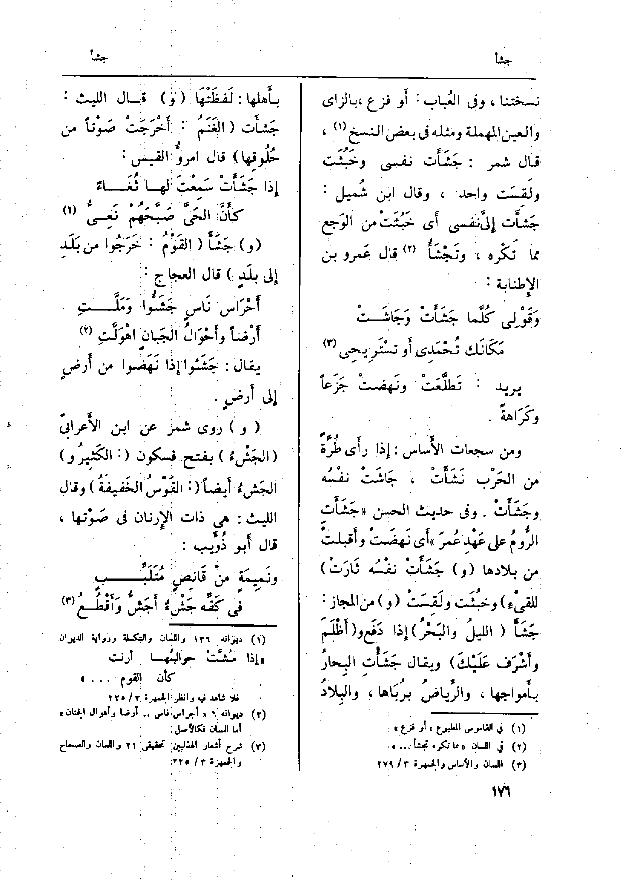 نسختنا، وَفِي (العُباب) : أَو فزع، بالزاي وَالْعين الْمُهْملَة وَمثله فِي بعض النّسخ، قَالَ شمر: جَشَأَت نَفسِي وخَبُثَت ولَقِسَت وَاحِد، وَقَالَ ابْن شُميل: جَشأَت إِليَّ نَفسِي أَي خَبُثَتْ من الوَجع مِمَّا تَكْره، {وتَجْشَأُ قَالَ عَمرو بن الإطنابة: