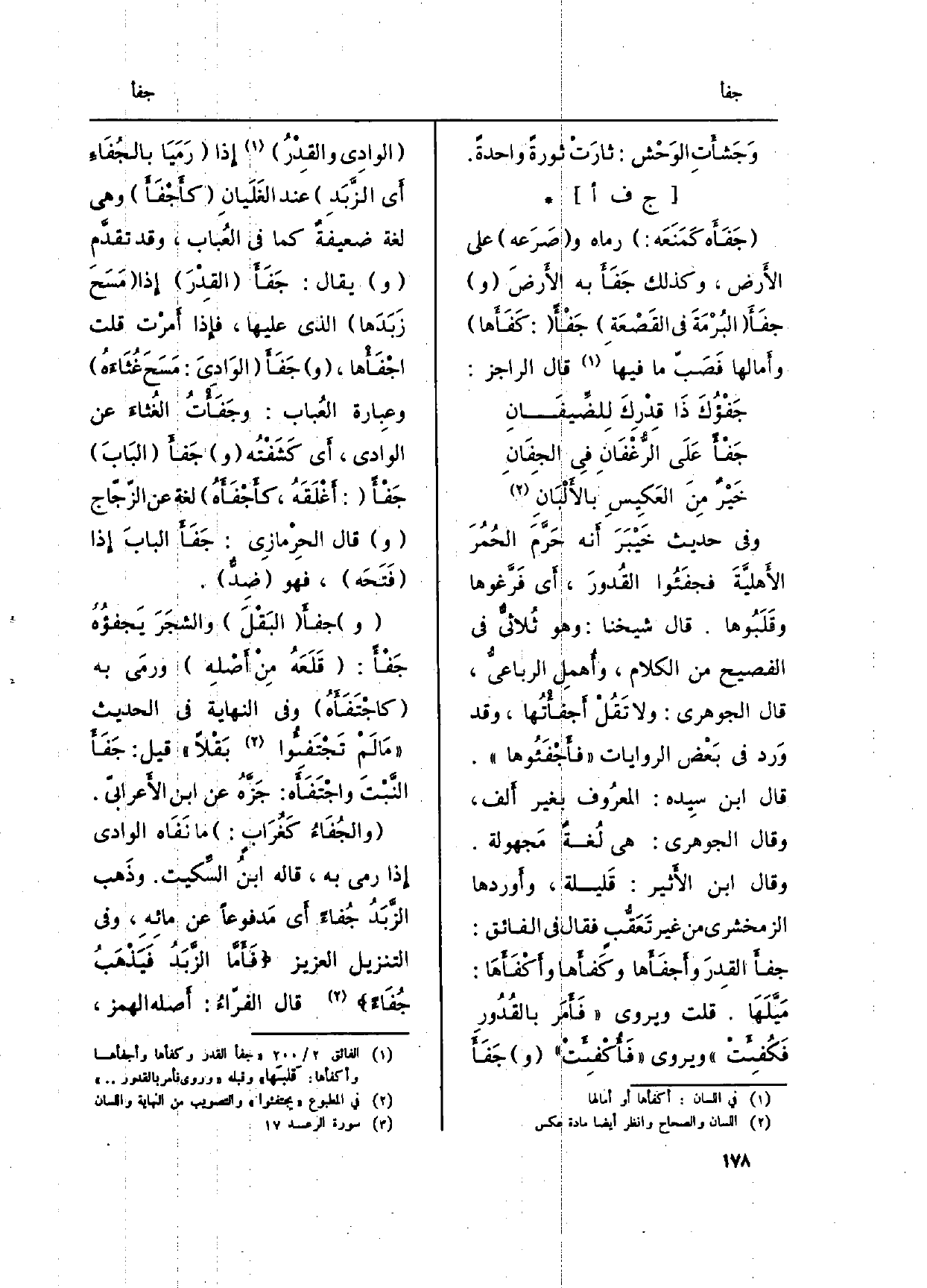 ( {والجُفَاءُ كَغُرَابٍ:) مَا نَفَاه الْوَادي إِذا رمى بِهِ، قَالَه ابنُ السِّكيت. وذَهب الزَّبَدُ} جُفاءً أَي مَدفوعاً عَن مائِهِ، وَفِي التَّنْزِيل الْعَزِيز: {فَأَمَّا الزَّبَدُ فَيَذْهَبُ جُفَآء} (الرَّعْد: 17) قَالَ الفرّاءُ: أَصله الْهَمْز،