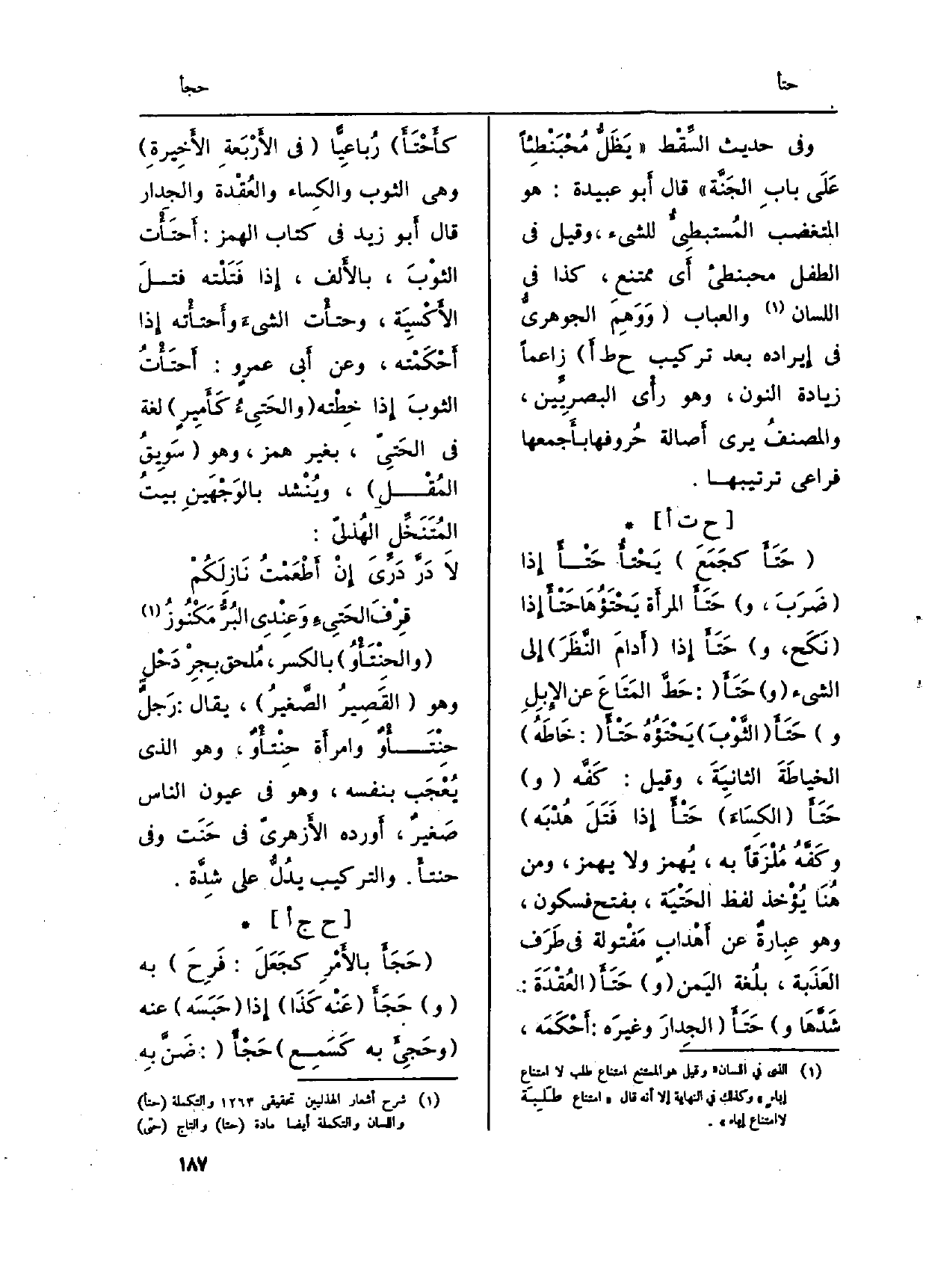 : ( {حَتَأَ كجَمَعَ) } يَحْتأُ حَتْأً إِذا (ضَرَبَ، و) {حَتَأَ الْمَرْأَة} يحتؤها حتأ إِذا (نكح، و) {حتأ إِذا (أَدامَ النَّظَرَ) إِلى الشَّيْء (و) } حَتَأَ (: حَطَّ المَتَاعَ عَن الإِبِلِ و) {حَتَأَ (الثَّوْبَ) يَحْتَؤُهُ حَتْأً (: خَاطَهُ) الخياطَةَ الثانِيَةَ، وَقيل: كَفَّه (و) حَتَأَ (الكِسَاءَ) حَتْأً إِذا فَتَلَ هُدْبَه وكَفَّهُ مُلْزَقاً بِهِ، يُهمز وَلَا يهمز، وَمن هُنَا يُؤْخذ لفظ الحَتْيَة، بِفَتْح فَسُكُون، وَهُوَ عِبارةٌ عَن أَهْدابٍ مَفْتولة فِي طَرَف العَذَبة، بلُغة اليَمن (و) } حَتَأَ (العَقْدَةَ: شَدَّهَا و) {حَتَأَ (الجدارَ وغيرَه: أَحْكَمَه،} كأَحْتَأَ) رُباعِيًّ (فِي الأَرْبَعةِ الأَخِيرةِ) وَهِي الثَّوْب والكساء والعُقْدة والجِدار قَالَ أَبو زيد فِي كتاب الْهَمْز: {أَحتَأْت الثوْبَ، بالأَلف، إِذا فَتَلْته فتلَا لأَكْسِيَة، وحتأْت الشيءَ} وأَحتأْته إِذا أَحْكَمْته، وَعَن أَبي عَمْرو: أَحتأْتُ الثوبَ إِذا خِطْته ( {- والحَتِيءُ كَأَمِيرٍ) لُغَة فِي الحَتِيّ، بِغَيْر همز، وَهُوَ (سَوِيقُ المُقْلِ) ، ويُنْشد بالوَجْهَينِ بيتُ المُتَنَخِّل الهُذليّ: