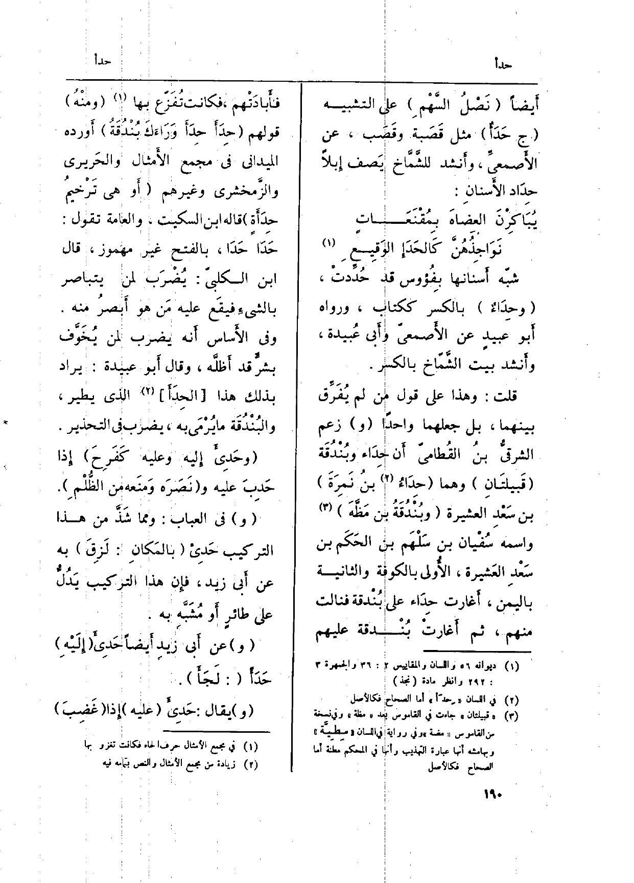قلت: وَهَذَا على قَول من لم يُفَرِّق بَينهمَا، بل جَعلهمَا وَاحِدًا (و) زعم الشرقيُّ بنُ القُطاميّ أَن حِدَاء وبُنْدُقَة (قَبيلتَانِ) وهما (} حِدَاءُ بنُ نَمِرَةَ) بن سَعْدِ الْعَشِيرَة (وبُنْدُقَةُ بن مَظَّهَ) واسْمه سُفْيان بن سَلْهَم بن الحَكَم بن سَعْدِ العَشيرة، الأُولى بِالْكُوفَةِ وَالثَّانيَِة بِالْيمن، أَغارت حِدَاء على بُنْدقة فنالت مِنْهُم، ثمَّ أَغارتْ بُنحدقة عَلَيْهِم فأَبادَتْهم، فَكَانَت تُفَزّع بهَا (ومنْهُ) قَوْلهم ( {حِدَأَ حِدَأَ وَرَاءَكَ بُنْدُقَةُ) أَورده الميداني فِي مجمع الأَمثال والحَريري والزَّمخشري وَغَيرهم (أَو هِيَ تَرْخيمُ} حِدَأَةٍ) قَالَه ابْن السّكيت، والعامة تَقول: {حَدَا حَدَا، بِالْفَتْح غير مَهْمُوز، قَالَ ابْن الكلبيّ: يُضْرَب لمن يتباصر بالشيءِ فيقَع عَلَيْهِ مَن هُوَ أَبصرُ مِنْهُ. وَفِي الأَساس أَنه يضْرب لمن يُخَوَّف بشرَ قد أَظلَّه، وَقَالَ أَبو عُبَيْدَة: يُرَاد بذلك هَذَا (} الحِدَأَ) الَّذِي يطير، والبُنْدُقَة مَا يُرْمَى بِهِ، يضْرب فِي التحذير.