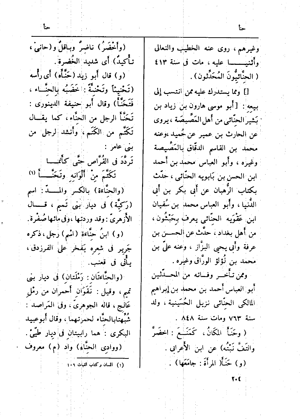 (! والحِنَّاءَتَانِ: رَمْلَتانِ) فِي ديار بني تَمِيم، وَقيل: نَقَوَانِ أَحمران من رمْلِ عَالِج، قَالَه الجوهريّ، وَفِي (المَراصد) : شُبِّهتا بالحِنَّاء لحمرتهما، وَقَالَ أَبُو عبيد الْبكْرِيّ: هما رابيتانِ فِي دِيار طيّيء.