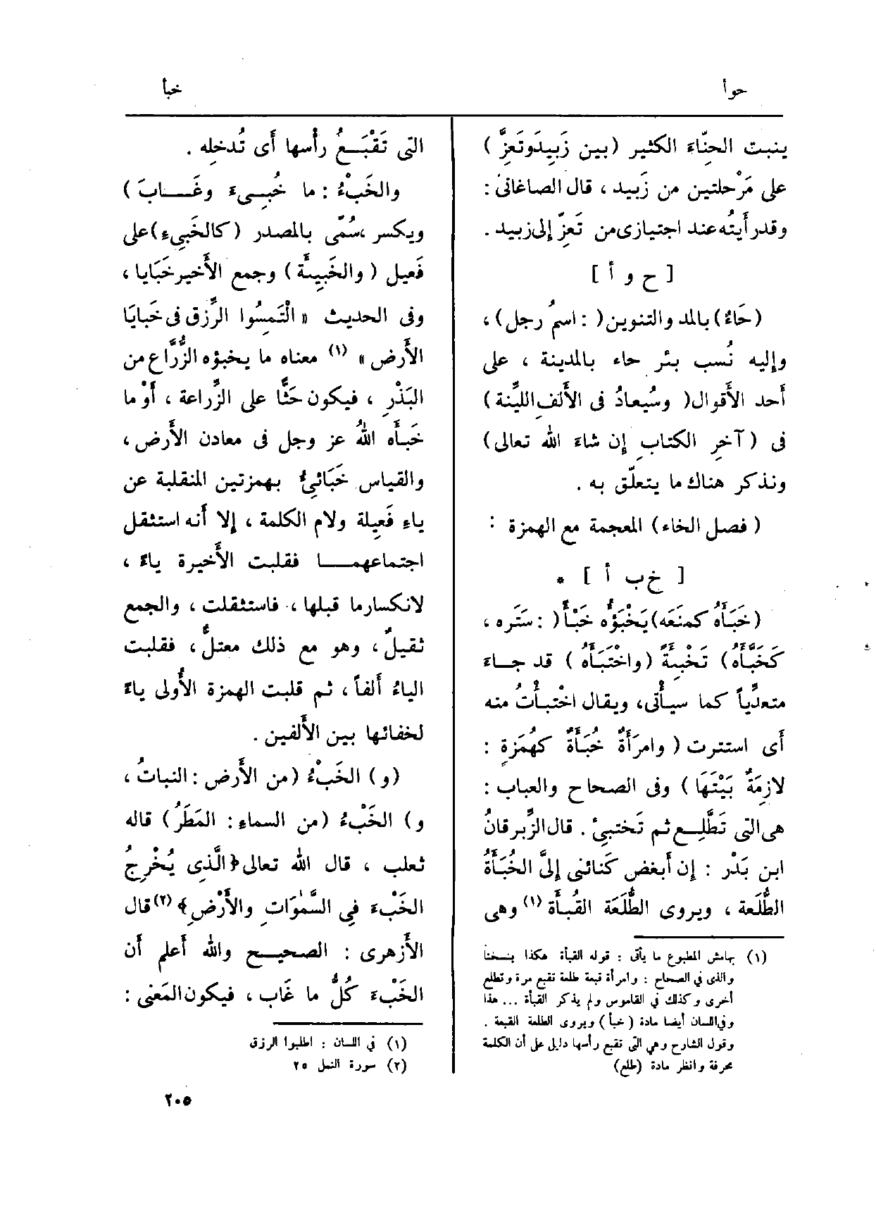 (و) {الخَبْءُ (من الأَرض: النباتُ، و) } الخَبْءُ (من السماءِ: المَطَرُ) قَالَه ثَعْلَب، قَالَ الله تَعَالَى: {1. 015 الَّذِي يخرج الخبء من السَّمَاوَات وَالْأَرْض} (النَّمْل: 25) قَالَ الأَزهري: الصَّحِيح وَالله أَعلم أَن الخَبْءَ كُلُّ مَا غَاب، فَيكون المَعنى:
