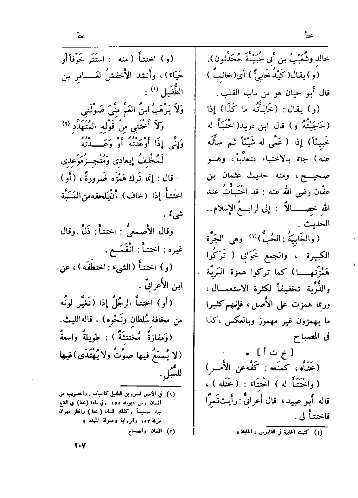 (} واخْتَتَأَ لَهُ) {اخْتِتَاءً: (خَتَله) ، قَالَه أَبو عبيد، قَالَ أَعرابيٌّ: رأَيت نَمِراً فاختتأَ لي.