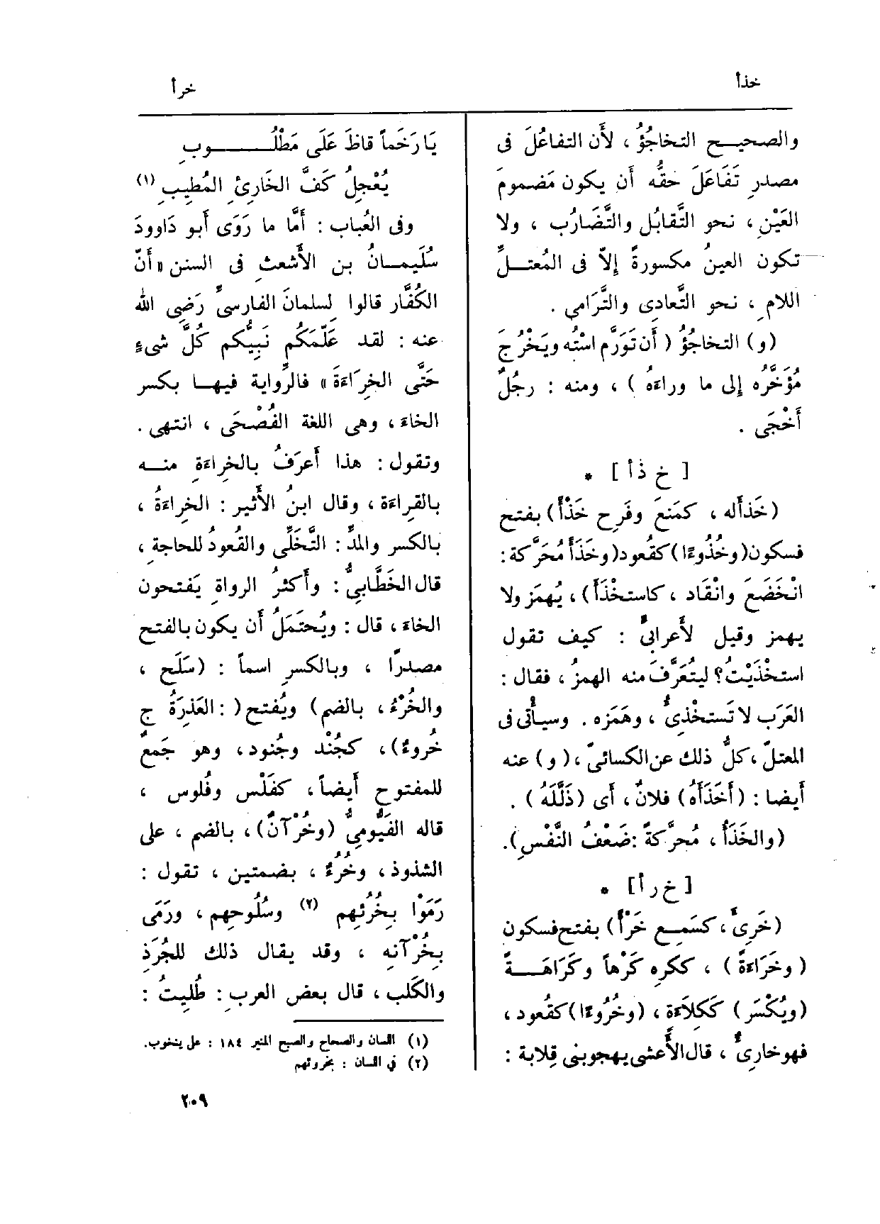 وَالصَّحِيح التخاجُؤُ، لأَن التفاعُلَ فِي مصدرِ تَفَاعَلَ حقُّه أَن يكون مَضمومَ العَيْنِ، نَحْو التَّقابُل والتَّضَارُب، وَلَا تكون العينُ مَكْسُورَة إِلاّ فِي المُعتلِّ اللامِ، نَحْو التَّعادِي والتَّرَامي.