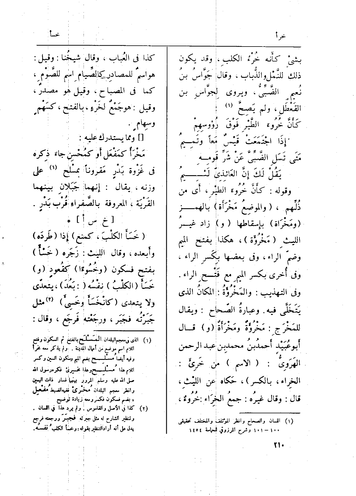 وَقَوله: كأَنَّ خُرُوءَ الطيْرِ، أَي من ذُلِّهم، (والموضِعُ {مَخْرَأَة) بِالْهَمْز (} ومَخْرَاة) بإِسقاطها (و) زَاد غيرُ الليثِ ( {مَخْرُؤَة) ، هَكَذَا بِفَتْح الْمِيم وضمّ الرَّاء، وَفِي أُخرى بِكَسْر الْمِيم مَعَ فَتْح الرَّاء. وَفِي (التَّهْذِيب) :} والمَخْرُؤَةُ: المكانُ الَّذِي يَتَخَلَّى فِيهِ. وعبارةُ (الصّحاح) : وَيُقَال للمَخْرَجِ: مَخْرُؤَةٌ {ومَخْرَأَةٌ (و) قَالَ أَبو عُبَيْد أَحمدُ بنُ محمدِ بن عبد الرحمان الهَرَوِيُّ: (الِاسْم) من خَرِيءَ:} الخِراء، بِالْكَسْرِ، حَكاه عَن الليْثِ، قَالَ: وَقَالَ غيرُه: جمعُ الخِرَاء: خُرُوءٌ، كَذَا فِي (العُباب) ، وَقَالَ شيخُنا: وَقيل: هُوَ اسمٌ للمصادِر كالصِّيامِ اسْم للصَّوْمِ، كَمَا فِي (الْمِصْبَاح) ، وَقيل هُوَ مصدرٌ، وَقيل: هُوَ جَمْعٌ {لخَرْءٍ، بِالْفَتْح، كسَهْمٍ وسِهامٍ.