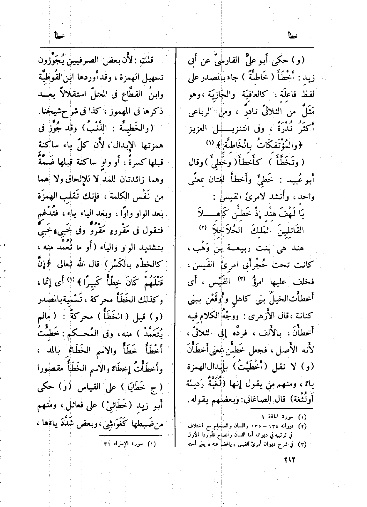 هِنْد هِيَ بنت ربيعَة بن وَهْب، كَانَت تَحت حُجْر أَبي امرِىء القَيس، فخلف عَلَيْهَا امرؤُ القَيْس، أَي} أَخطأَت الخيلُ بني كاهلٍ وأَوقَعْن ببني كنَانَة، قَالَ الأَزهري: ووجْهُ الكلامِ فِيهِ أَخطأْنَ، بالأَلف، فردَّه إِلى الثلاثيّ، لأَنه الأَصل، فَجعل {خَطِئْن بِمَعْنى} أَخطَأْنَ (و) لَا تقل (أَخْطَيْتُ) بإِبدال الْهمزَة يَاء، وَمِنْهُم من يَقُول إِنها (لُغَيَّةٌ رَديئة أَو لُثْغة) قَالَ الصَّاغَانِي: وَبَعْضهمْ يَقُوله.