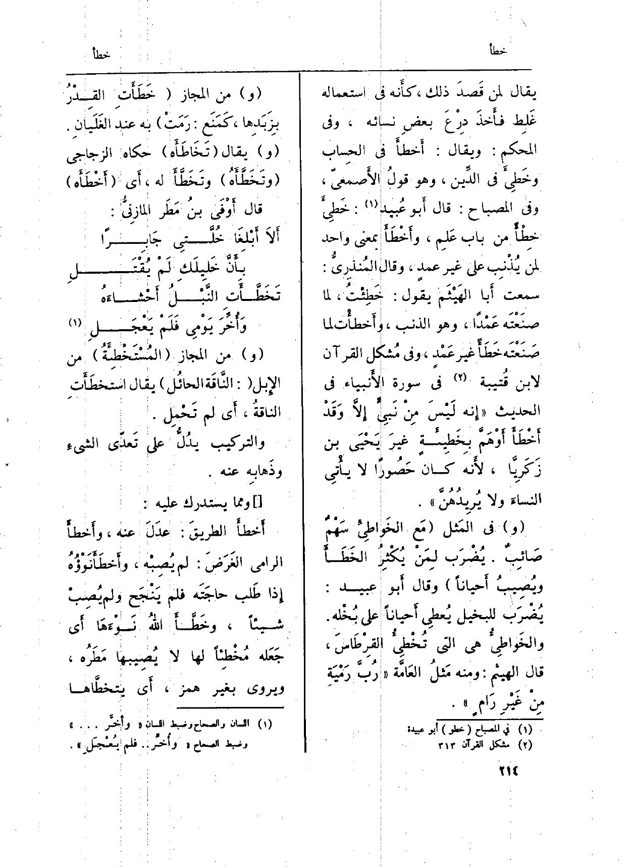 يُقَال لمن قَصدَ ذَلِك، كأَنه فِي اسْتِعْمَاله غَلِط فأَخذَ دِرْعَ بعضِ نِسَائِهِ، وَفِي (الْمُحكم) : وَيُقَال: أَخطأَ فِي الحِساب وخَطِيءَ فِي الدِّين، وَهُوَ قولُ الأَصمعيّ، وَفِي (الْمِصْبَاح) : قَالَ أَبو عُبيد: خَطِيءَ خطْأً من بَاب عَلم، وأَخْطَأَ بِمَعْنى وَاحِد لمن يُذْنِب على غير عمدٍ، وَقَالَ المُنذِريُّ: سَمِعت أَبا الهَيْثَم يَقُول: خَطِئْتُ، لما صنَعْتَه عَمْداً، وَهُوَ الذَّنب، وأَخطأْت لما صَنَعْتَه خَطَأً غير عَمْدٍ، وَفِي (مُشكل الْقُرْآن) لِابْنِ قُتيبة فِي سُورَة الأَنبياء فِي الحَدِيث (إِنه لَيْسَ مِنْ نَبِيَ إِلاَّ وَقَدْ أَخْطَأَ أَوْ هَمَّ بِخَطِيئَةٍ غيرَ يَحْيَى بن زَكَرِيَّا، لأَنه كَانَ حَصُوراً لَا يأْتِي النساءَ وَلَا يُرِيدُهُنَّ) .