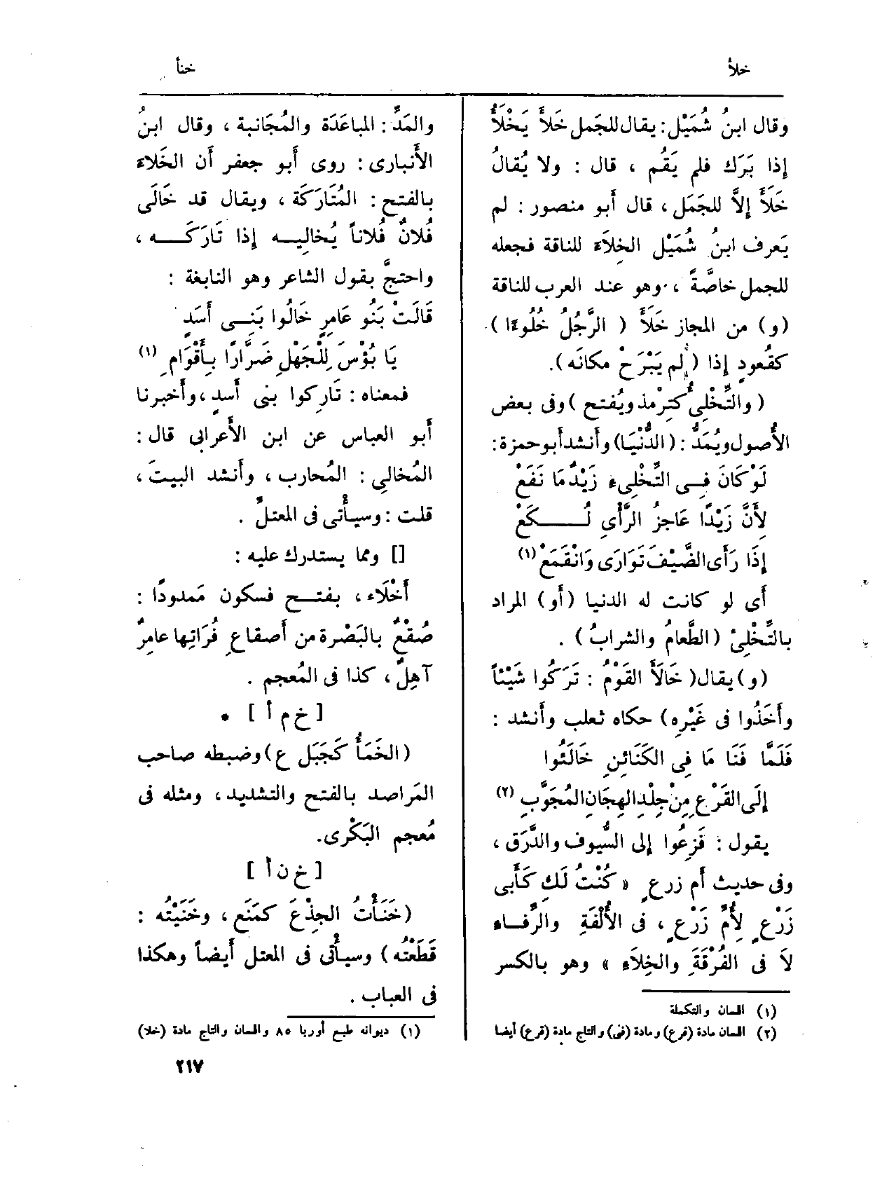 يَقُول: فَزِعُوا إِلى السُّيوف والدَّرَق، وَفِي حَدِيث أَم زرعٍ (كُنْتُ لَكِ كَأَبي زَرْعٍ لأُمِّ زَرْعٍ، فِي الأُلْفَةِ والرِّفاءِ لاَ فِي الفُرْقَةِ {والخِلاَءِ) وَهُوَ بِالْكَسْرِ والمَدِّ: المباعَدَة والمُجَانبة، وَقَالَ ابنُ الأَنباري: روى أَبو جَعْفَر أَن الخَلاءَ بِالْفَتْح: المُتَارَكَة، وَيُقَال قد خَالَى فُلانٌ فُلاناً يُخالِيه إِذا تَارَكَه، واحتجَّ بقول الشَّاعِر وَهُوَ النَّابِغَة: