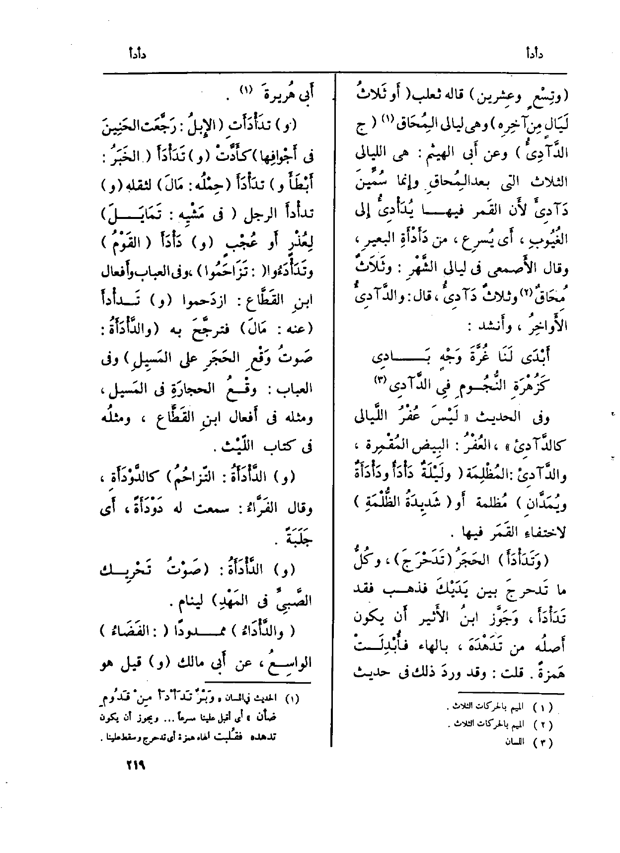 (وتِسْعٍ وعِشرين) قَالَه ثَعْلَب (أَو ثَلاثُ لَيَالٍ مِن آخِرِه) وَهِي ليَالِي المُحَاق (ج {الدَّآدِئُ) وَعَن أَبي الْهَيْثَم: هِيَ اللَّيَالِي الثَّلَاث الَّتِي بعد المِحاق وإِنما سُمِّينَ} دَآدِئَ لأَن القَمر فِيهَا يُدَأْدِيءُ إِلى الغُيُوبِ، أَي يُسرِع، من دَأَدْأَةِ البعيرِ، وَقَالَ الأَصمعي فِي ليَالِي الشَّهْرِ: وثَلاَثٌ مُحَاقٌ وثلاثٌ دَآدِيءُ، قَالَ: والدَّآدِيءُ الأَواخِرُ، وأَنشد: