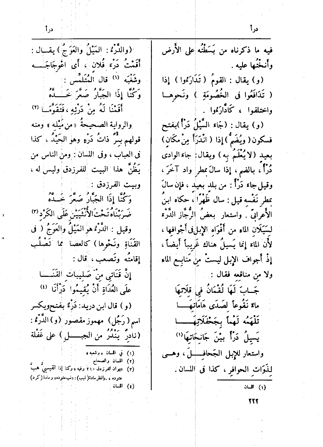 (و) يُقَال: (جَاءَ السَّيْلُ دَرْأً) بِفَتْح فَسُكُون (ويُضَمُّ) إِذا (انْدَرَأَ مِنْ مكَانٍ) بعيدٍ (لَا يُعْلَمُ بِه) وَيُقَال: جاءَ الْوَادي دُرْأً، بِالضَّمِّ، إِذا سالَ بمطرِ وَاد آخَرَ، وَقيل جاءَ دَرْأً: من بلدٍ بعيدٍ فإِن سالَ بمطرِ نَفْسِه قيل: سَالَ ظَهْراً، حَكَاهُ ابنُ الأَعرابيّ. واستعار بعضُ الرُّجَّاز الدَّرْءَ لِسَيَلاَنِ الماءِ من أَفْوَاهِ الإِبل فِي أَجْوافِها، لأَن المَاء إِنما يَسيلُ هُنَاكَ غَرِبياً أَيضاً، إِذْ أَجواف الإِبل ليستْ مِن مَنابِع الماءِ وَلَا مِن مناقِعِه فَقَالَ: