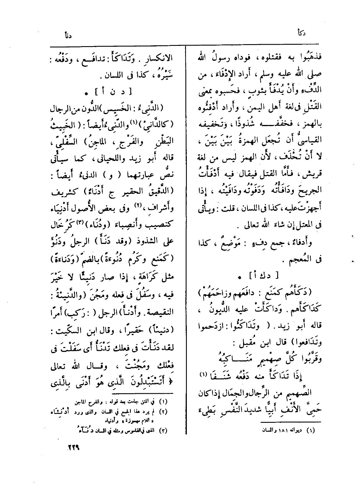 : ( {- الدَّنِيءُ: الخَسيِس) الدُّون من الرِّجَال (} كالدَّانِئ) {- والدّنِيءُ أَيضاً: (الخَبِيثُ البَطْنِ والفَرْجِ، الماجِنُ) السِّفْلِيّ، قَالَه أَبو زيد واللحياني، كَمَا سيأْتي نصُّ عبارتهما (و) } الدنيءُ أَيضاً: (الدَّقيقُ الحقير ج {أَدْنَاءٌ) كشريف وأَشرافٍ، وَفِي بعض الأُصول} أَدْنِيَاء كنصيب وأَنصِباءَ ( {ودُنَاء) كَرُخَال على الشذوذ (وَقد} دَنَأَ) الرجلُ {ودَنُؤَ (كَمَنع وكَرُم} دُنُوءَةً) بالضمّ ( {وَدَناءَةً) مثل كَرَاهَةٍ، إِذا صَار} دَنِيئًا لَا خَيْرَ فِيهِ، وسَفُلَ فِي فعله ومَجُنَ ( {والدَّنِيئةُ: النقيصة.} وأَدْنأَ) الرجل (: رَكِب) أَمراً ( {دنيئاً) حَقيراً، وَقَالَ ابْن السكّيت: لقد} دَنَأْتَ فِي فِعلك {تَدْنَأُ أَي سَفَلْتَ فِي فِعْلك ومَجُنْتَ، وَقَالَ الله تَعَالَى {أَتَسْتَبْدِلُونَ الَّذِى هُوَ أَدْنَى بِالَّذِى هُوَ خَيْرٌ} (الْبَقَرَة: 61) قَالَ الفراءُ: هُوَ من الدَّناءَةِ، وَالْعرب تَقول: إِنه لَدَنِيءٌ فِي الأُمور، غير مَهْمُوز، يَتَّبِعُ خَسِيسَها وأَصاغِرَها، وَكَانَ زُهَيْرٌ الفُرْقُبِيّ يهمز (هُوَ} أَدنَى بِالَّذِي