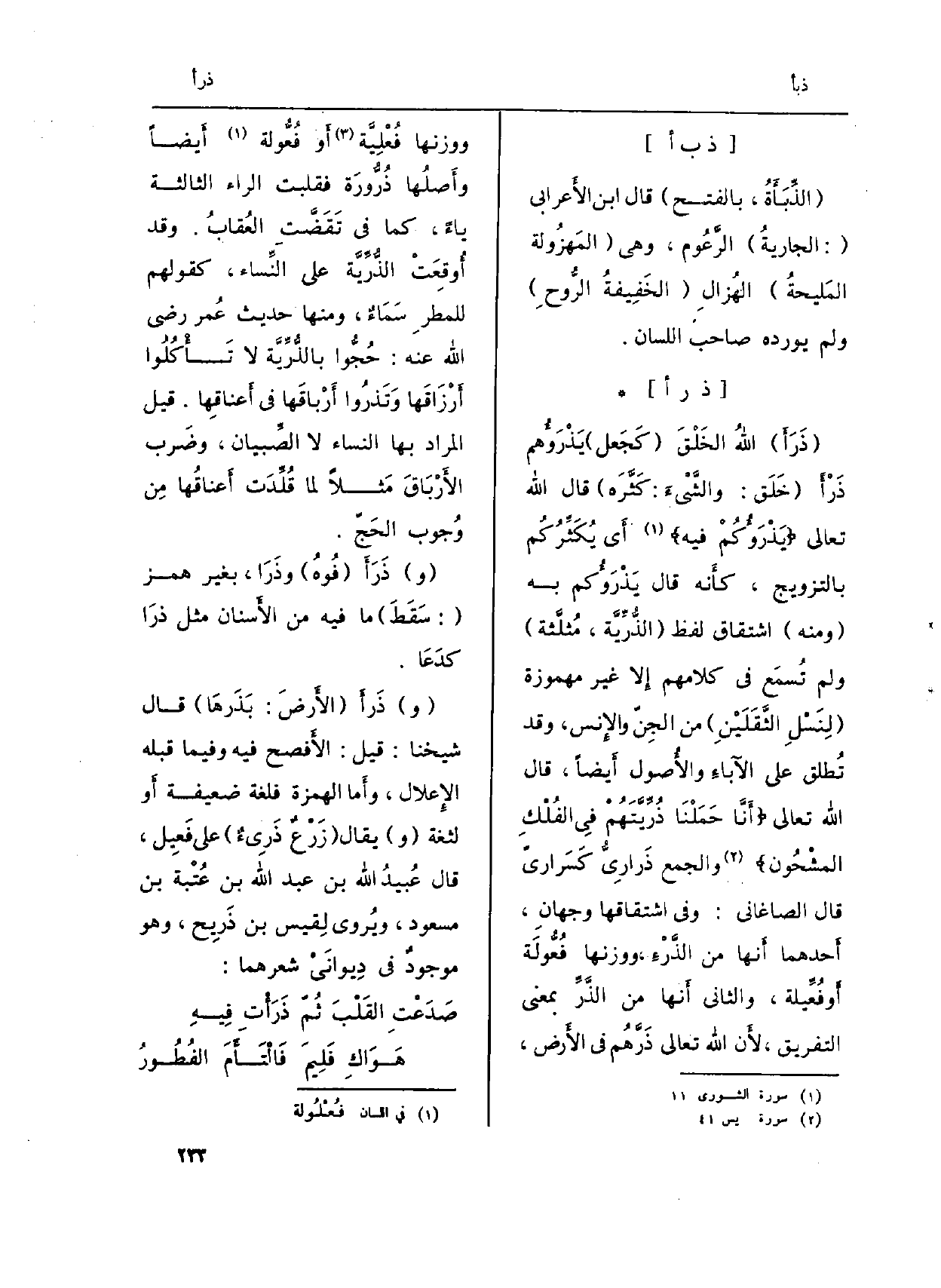 : (} ذَرَأَ) اللَّهُ لخَلْقَ (كَجَعل) {يَذْرَؤُهم} ذَرْأً (خَلَق: والشَّيْءَ: كَثَّرَه) قَالَ الله تَعَالَى: { {يَذْرَؤُكُمْ فِيهِ} (الشورى: 11) أَي يُكَثِّرُكُم بِالتَّزْوِيجِ، كأَنه قَالَ} يَذْرَؤُكم بِهِ (وَمِنْه) اشتقاق لفظ ( {الذُّرِّيَّة، مُثلَّثة) وَلم تُسمَع فِي كَلَامهم إِلا غير مَهْمُوزَة (لِنَسْلِ الثَّقَلَيْنِ) من الجِنّ والإِنس، وَقد تُطلق على الآباءِ والأُصول أَيضاً، قَالَ الله تَعَالَى: {أَنَّا حَمَلْنَا ذُرّيَّتَهُمْ فِى الْفُلْكِ الْمَشْحُونِ} (يس: 41) وَالْجمع} ذَرارِيُّ كَسَراريّ قَالَ الصَّاغَانِي: وَفِي اشتقاقها وجهانِ، أَحدهما أَنها من {الذَّرْءِ، ووزنها فُعُّولَة أَو فُعِّيلة، وَالثَّانِي أَنها من الذَّرِّ بِمَعْنى التَّفْرِيق، لأَن الله تَعَالَى ذَرَّهُم فِي الأَرض، ووزنها فُعْلِيَّة أَو فُعُّولة أَيضاً وأَصلُها ذُرُّورَة فقلبت الرَّاء الثَّالِثَة يَاء، كَمَا فِي تَقَضَّتِ العُقابُ. وَقد أُوقِعَتْ الذُّرِّيَّة على النِّساء، كَقَوْلِهِم للمطرِ سَمَاءٌ، وَمِنْهَا حَدِيث عُمر رَضِي الله عَنهُ. حُجُّوا بالذُّرِّيَّة لَا تَأْكُلُوا أَرْزَاقَها وَتَذرُوا أَرْباقَها فِي أَعناقِها. قيل المُرَاد بهَا النِّسَاء لَا الصِّبيان، وضَرب الأَرْبَاقَ مَثلاً لما قُلِّدَت أَعناقُها مِن وُجوب الحَجّ.
