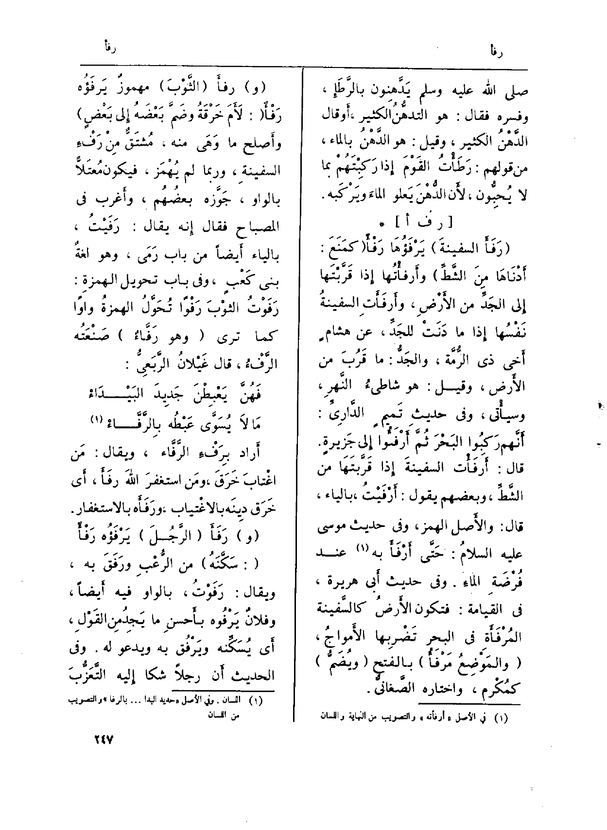 : ( {رَفَأَ السفينةَ) } يَرْفَؤُهَا {رَفْأً (كمَنَعَ: أَدْنَاهَا مِنَ الشَّطِّ) } وأَرفأْتُها إِذا قَرَّبْتَها إِلى الجَدِّ من الأَرْضِ، {وأَرفَأَتِ السفينةُ نَفْسُها إِذا مَا دَنَتْ للجَدِّ، عَن هشامٍ أَخي ذِي الرُّمَّة، والجَدُّ: مَا قَرُبَ من الأَرض، وَقيل: هُوَ شاطىءُ النَّهرِ، وسيأْتي، وَفِي حديثِ تَمِيمٍ الدَّارِيِّ: أَنَّهم رَكِبُوا البَحْرَ ثُمَّ} أَرْفَئُوا إِلى جَزيرةٍ. قَالَ: {أَرفَأْت السفينةَ إِذا قَرَّبتَهَا من الشَّطِّ، وَبَعْضهمْ يَقُول:} أَرْفَيْتُ، بِالْيَاءِ، قَالَ: والأَصل الْهَمْز، وَفِي حَدِيث مُوسَى عَلَيْهِ السلامُ: حَتَّى {أَرْفَأَ بِهِ عِنْد فُرْضَةِ الماءِ. وَفِي حَدِيث أَبي هُرَيْرَة، فِي الْقِيَامَة: فَتكون الأَرضُ كالسَّفينة المُرْفَأَةِ فِي الْبَحْر تَضْرِبها الأَمواجُ، (والمَوْضِعُ} مَرْفَأُ) بِالْفَتْح (ويُضَمُّ) كمُكْرم، وَاخْتَارَهُ الصَّغانيُّ.