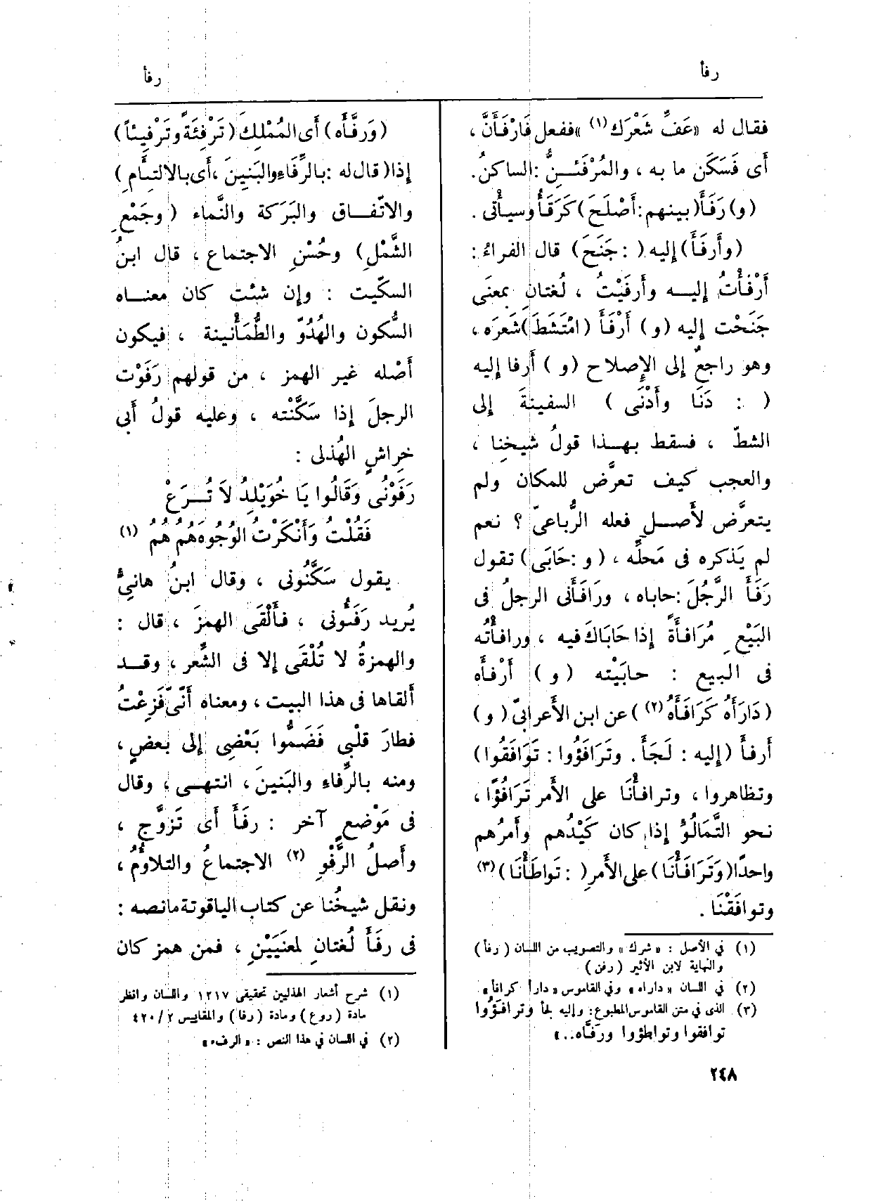 ( {وأَرفَأَ) إِليه (: جَنَحَ) قَالَ الفراءُ:} أَرْفأْتُ إِليه {وأَرفَيْتُ، لُغتان بمعنَى جَنَحْت إِليه (و) أَرْفَأَ (امْتَشَطَ) شَعرَه، وَهُوَ راجعٌ إِلى الإِصلاح (و) أَرفا إِليه (: دَنَا وأَدْنَى) السَّفِينَة إِلى الشطّ، فَسقط بِهَذَا قَول شيخِنا، وَالْعجب كَيفَ تعرَّض للمكان وَلم يتعرَّض لأَصل فعله الرُّباعيّ؟ نعم لم يَذكره فِي مَحلِّه، (و: حَابَى) تَقول رَفَأَ الرَّجُلَ: حاباه، ورَافَأَني الرجلُ فِي البَيْعِ مُرَافأَةً إِذا حَابَاكَ فِيهِ، ورافأْتُه فِي البيع: حابَيْته (و) رْفأَه (دَارَأَهُ} كَرَافَأْهُ) عَن ابْن الأَعرابيّ (و) أَرفأَ (إِليه: لَجَأَ. {وتَرَافَؤُوا: تَوَافَقُوا) وتظاهروا،} وترافأْنَا على الأَمر {تَرَافُؤاً، نَحْو التَّمَالُؤِ إِذا كَانَ كَيْدُهم وأَمرُهم وَاحِدًا (} وَتَرَافَأْنَا) على الأَمرِ (: تَواطَأْنَا) وتوافَقْنَا.