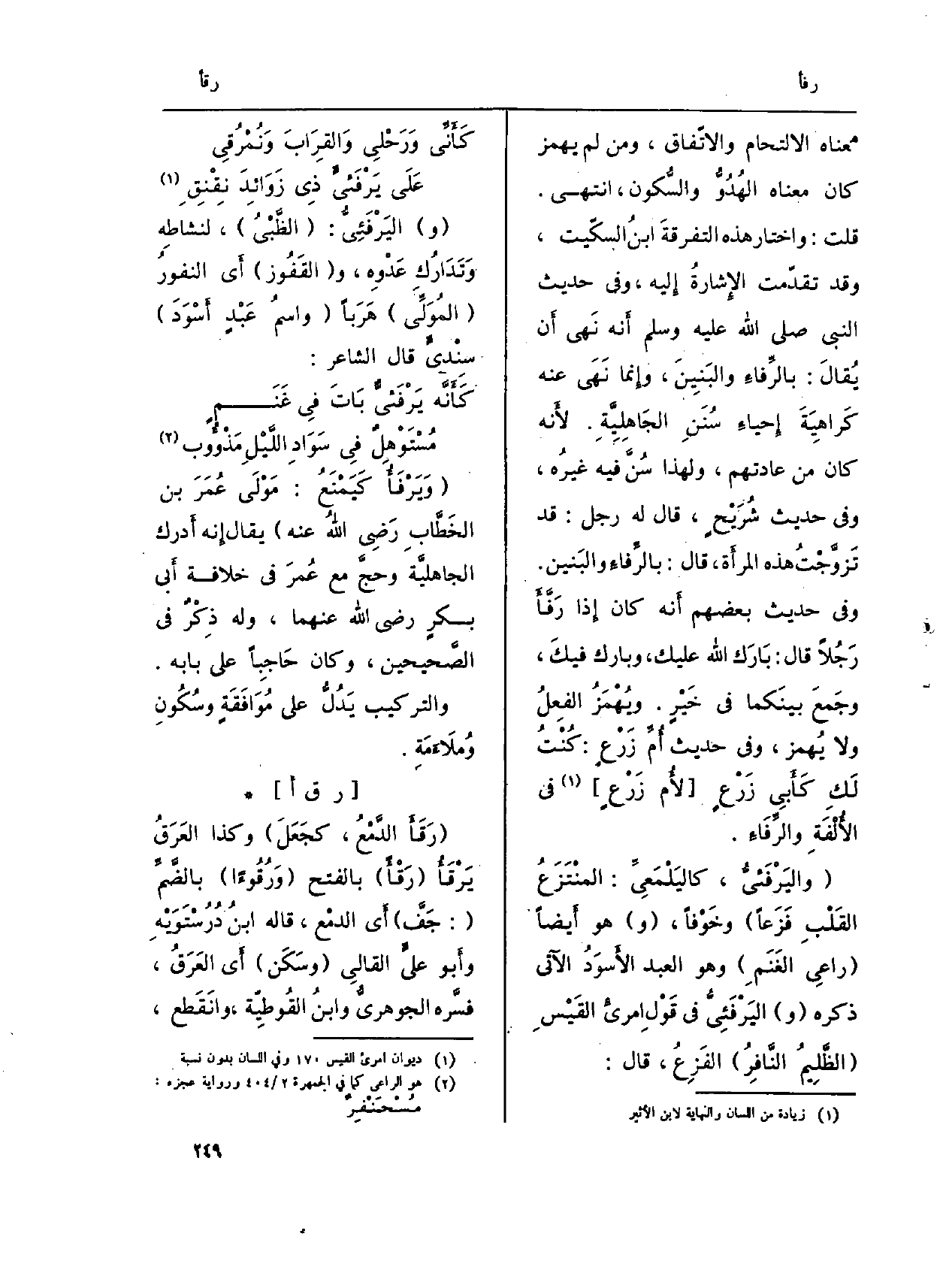 مَعْنَاهُ الالتحام والاتّفاق، وَمن لم يهمز كَانَ مَعْنَاهُ الهُدُوُّ والسُّكون، انْتهى. قلت: وَاخْتَارَ هَذِه التفرقةَ ابنُ السكّيت، وَقد تقدّمت الإِشارةُ إِليه، وَفِي حَدِيث النَّبِي صلى الله عَلَيْهِ وسلمأَنه نَهى أَن يُقالَ: بالرِّفاءِ والبَنِينَ، وإِنما نَهَى عَنهُ كَراهِيَةَ إِحياءِ سُنَنِ الجَاهِلِيَّةِ. لأَنه كَانَ من عَادَتهم. وَلِهَذَا سُنَّ فِيهِ غيرُه، وَفِي حَدِيث شُرَيْحٍ، قَالَ لَهُ رجل: قد تَزوَّجْتُ هَذِه المرأَة، قَالَ: بالرِّفاءِ والبَنين. وَفِي حَدِيث بَعضهم أَنه كَانَ إِذا {رَفَّأَ رَجُلاً قَالَ: بَارَك الله عَلَيْك، وَبَارك فيكَ، وجَمعَ بينَكما فِي خَيْرٍ. ويُهْمَزُ الفِعلُ وَلَا يُهمز، وَفِي حَدِيث أُمِّ زَرْعٍ: كُنْتُ لَكِ كَأَبِي زَرْعٍ (لأُم زَرْعٍ) فِي الأُلْفَةِ} والرِّفَاءِ.