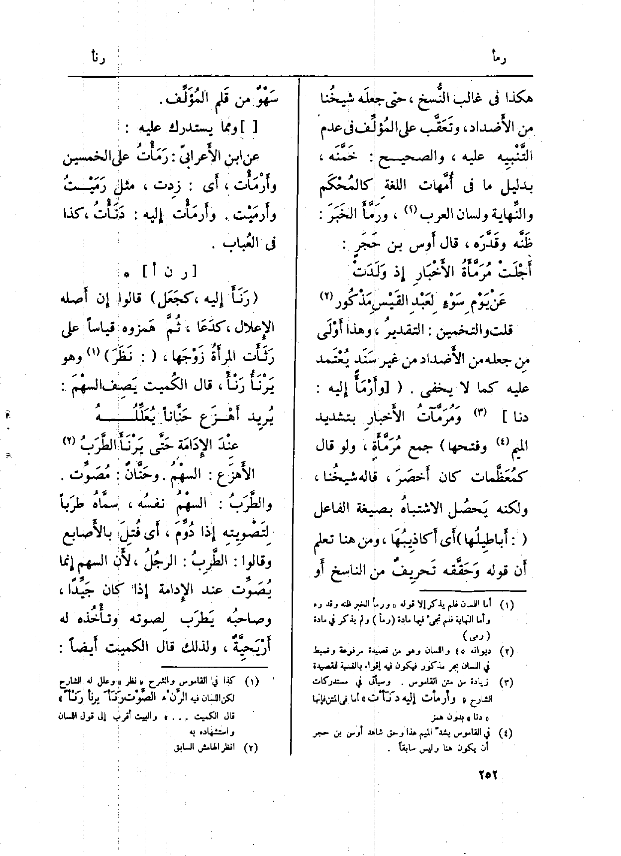 قلت والتخمين: التقديرُ، وَهَذَا أَوْلَى مِن جعله من الأَضداد من غير سَنَد يُعْتَمد عَلَيْهِ كَمَا لَا يخفى. (( {وأَرْمَأَ إِليه: دنا) } وَمُرَمَّآتُ الأَخبارِ بتَشْديد الْمِيم وَفتحهَا) جمع {مُرَمَّأَةٍ، وَلَو قَالَ كمُعَظَّمات يَحصُل الاشتباهُ بِصِيغَة الفالع (: أَباطيِلُها) أَي أَكاذِيبُهَا، وَمن هُنَا تعلم أَن قَوْله وَحَقَّه تَحرِيفٌ من النَّاسِخ أَو سَهْوٌ من قَلم المُؤَلِّف.