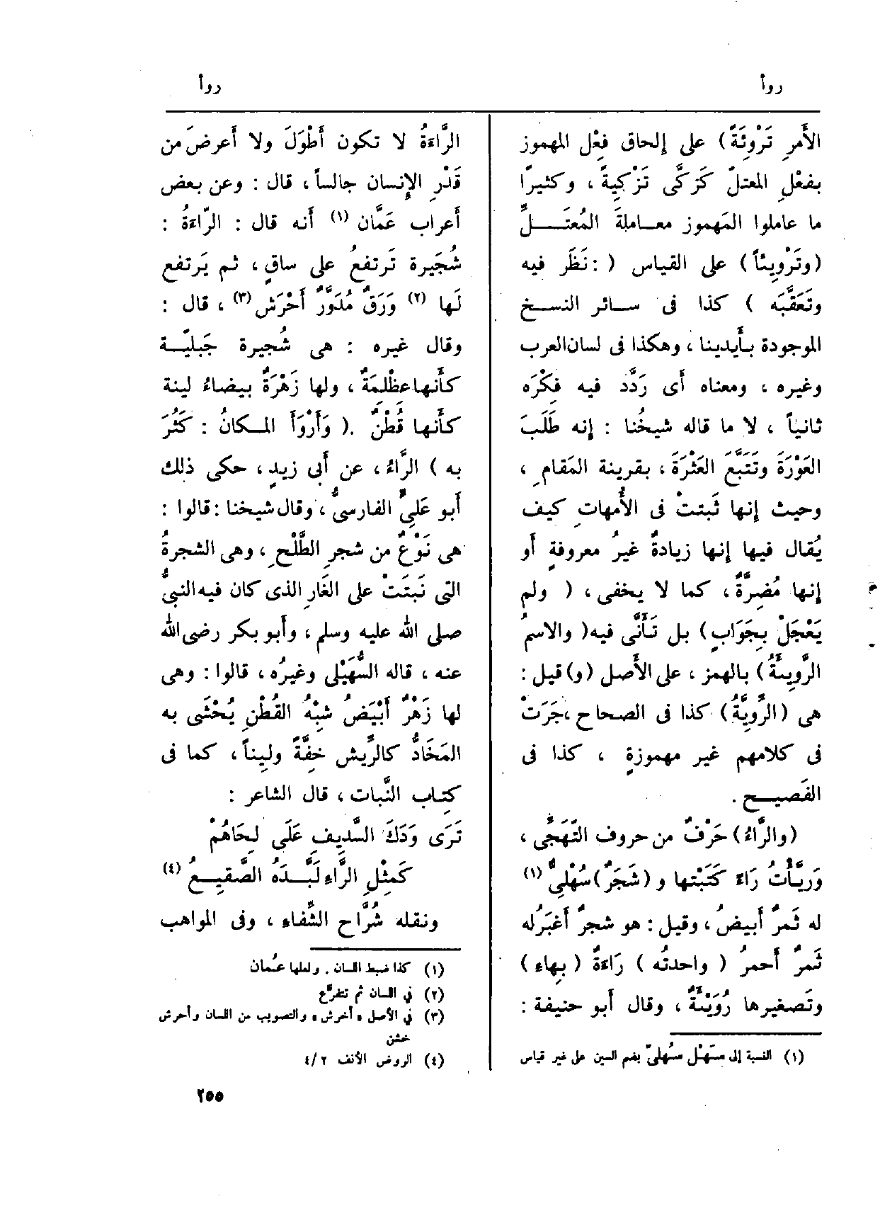 ( {والرَّاءُ) حَرْفٌ من حُرُوف التّهَجِّي،} وَريَّأْتُ رَاءً كَتَبْتها و (شَجَرٌ) سُهْلِيٌّ لَهُ ثَمرٌ أَبيضُ، وَقيل: هُوَ شجرٌ أَغبَرُ لَهُ ثَمرٌ أَحمرُ (واحدتُه) {رَاءَةٌ (بِهاءِ) وتَصغيرها} رُوَيْئَةٌ، وَقَالَ أَبو حنيفَة: {الرَّاءَةُ لَا تكون أَطْوَلَ وَلَا أَعرضَ من قَدْرِ الإِنسان جَالِسا، قَالَ: وَعَن بعض أَعراب عَمَّان أَنه قَالَ: الرّاءَةُ: شُجَيرة تَرتفعُ على ساقٍ، ثمَّ يَرتفع لَها وَرَقٌ مُدَوَّرٌ أَحْرَش، قَالَ: وَقَالَ غَيره: هِيَ شُجيرة جَبليّة كأَنها عِظْلِمَةٌ، وَلها زَهْرَةٌ بيضاءُ لينَة كأَنها قُطْنٌ. (} وَأَرْوَأَ المكانُ: كَثُرَ بِهِ) الرَّاءُ، عَن أَبي زيدٍ، حكى ذَلِك أَبو عَلِيَ الفارسيُّ، وَقَالَ شَيخنَا: قَالُوا: هِيَ نَوْعٌ من شجرِ الطَّلْعِ، وَهِي الشجرةُ الَّتِي نَبَتَتْ على الغَارِ الَّذِي كَانَ فِيهِ النبيُّ صلى الله عَلَيْهِ وَسلم وأَبو بكر رَضِي الله عَنهُ، قَالَه السُّهَيْلي وغيرُه، قَالُوا: وَهِي لَهَا زَهْرٌ أَبْيَضُ شِبْهُ القُطْنِ يُحْشَى بِهِ المَخَادُّ كالرِّيش خِفَّةً ولِيناً، كَمَا فِي كتاب النَّبات، قَالَ الشَّاعِر: