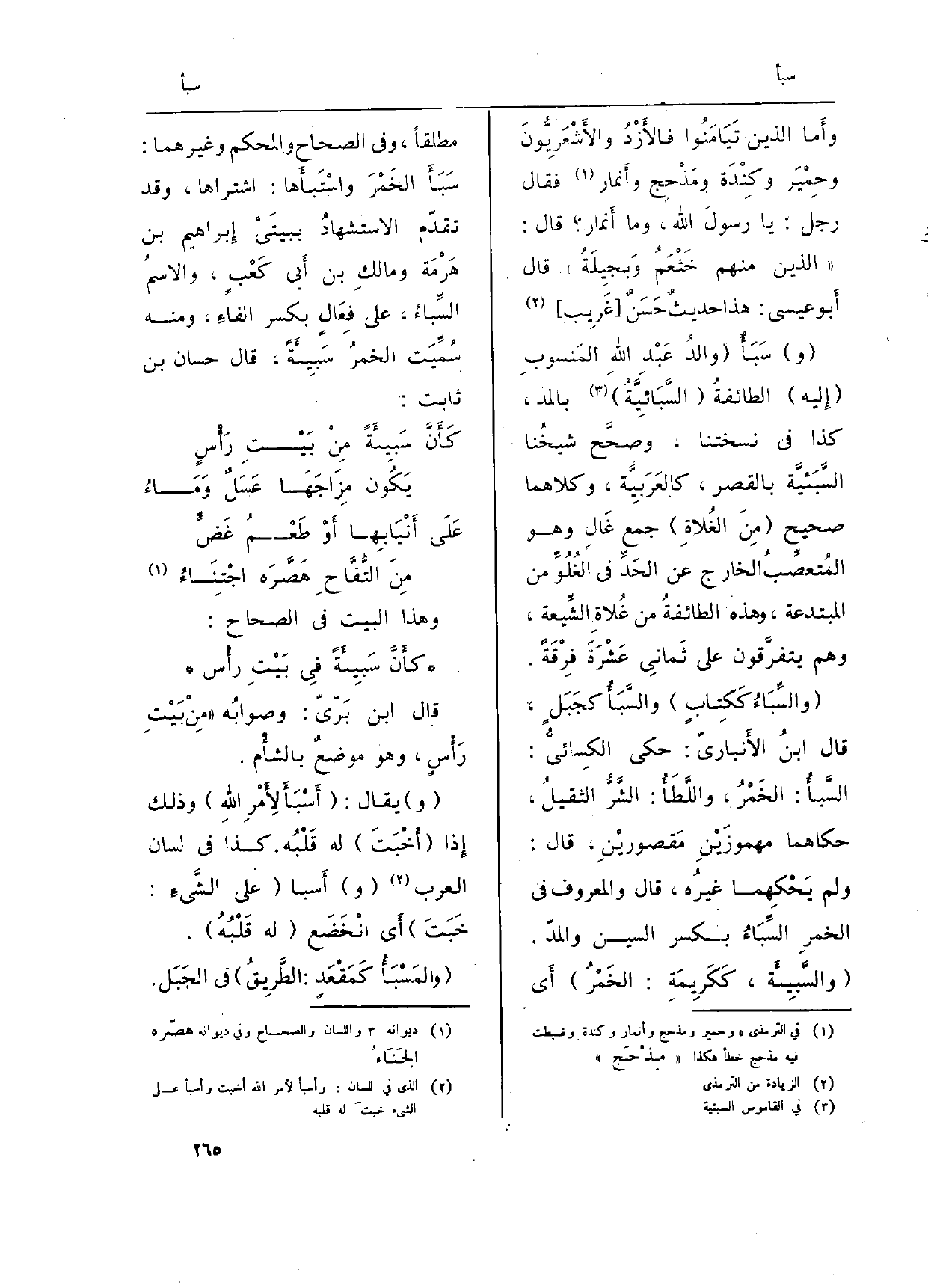 ( {والسِّبَاءُ كَكِتابٍ) والسَّبَأُ كجَبَلٍ، قَالَ ابنُ الأَنباريّ: حكى الكِسائيُّ: السَّبأُ: الخَمْرُ، واللَّطَأُ: الشَّرُّ الثقيلُ، حَكَاهُمَا مهموزَيْنِ مَقصوريْنِ، قَالَ: وَلم يَحْكِهما غيرُه، قَالَ وَالْمَعْرُوف فِي الخمرِ السِّبَاءُ بِكَسْر السِّين والمدّ. (} والسَّبِيئَة، كَكَرِيمَةِ: الخَمْرُ) أَي مُطلقًا، وَفِي (الصِّحَاح) و (الْمُحكم) وَغَيرهمَا: سَبَأَ الخَمْرَ واسْتَبأَها: اشْتَرَاهَا، وَقد تقدّم الاستشهادُ ببيتَيْ إِبراهيم بن هَرْمَة ومالكِ بن أَبي كَعْبٍ، والاسمُ السِّباءُ، على فِعَالٍ بِكَسْر الفاءِ، وَمِنْه سُمِّيَت الخمرُ {سَبِيئَةً، قَالَ حسان بن ثَابت:
