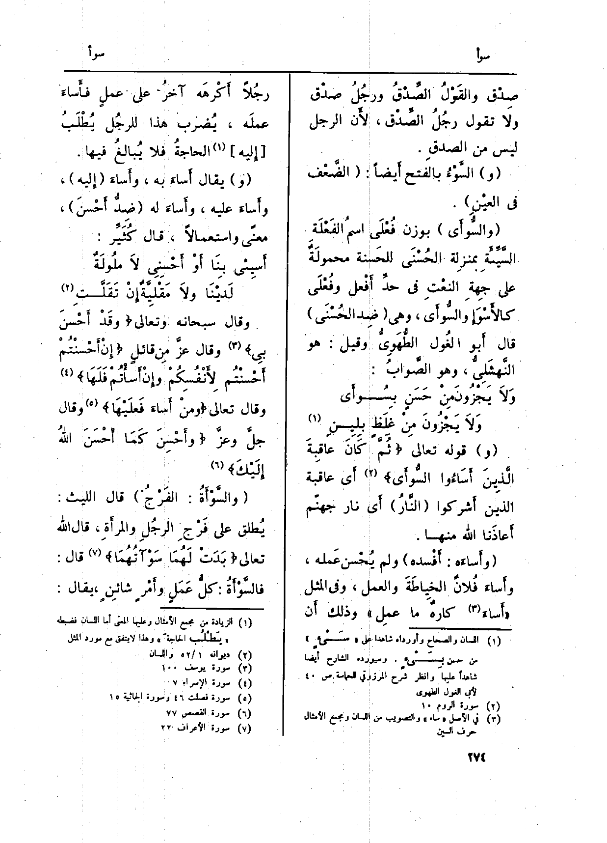 (و) قَوْله تَعَالَى {ثُمَّ كَانَ عَاقِبَةَ الَّذِينَ {أَسَاءوا} السُّوأى} (الرّوم: 10) أَي عَاقِبَة الَّذين أَشركوا (النَّارُ) أَي نَار جهنّم أَعاذَنا الله مِنْهَا.