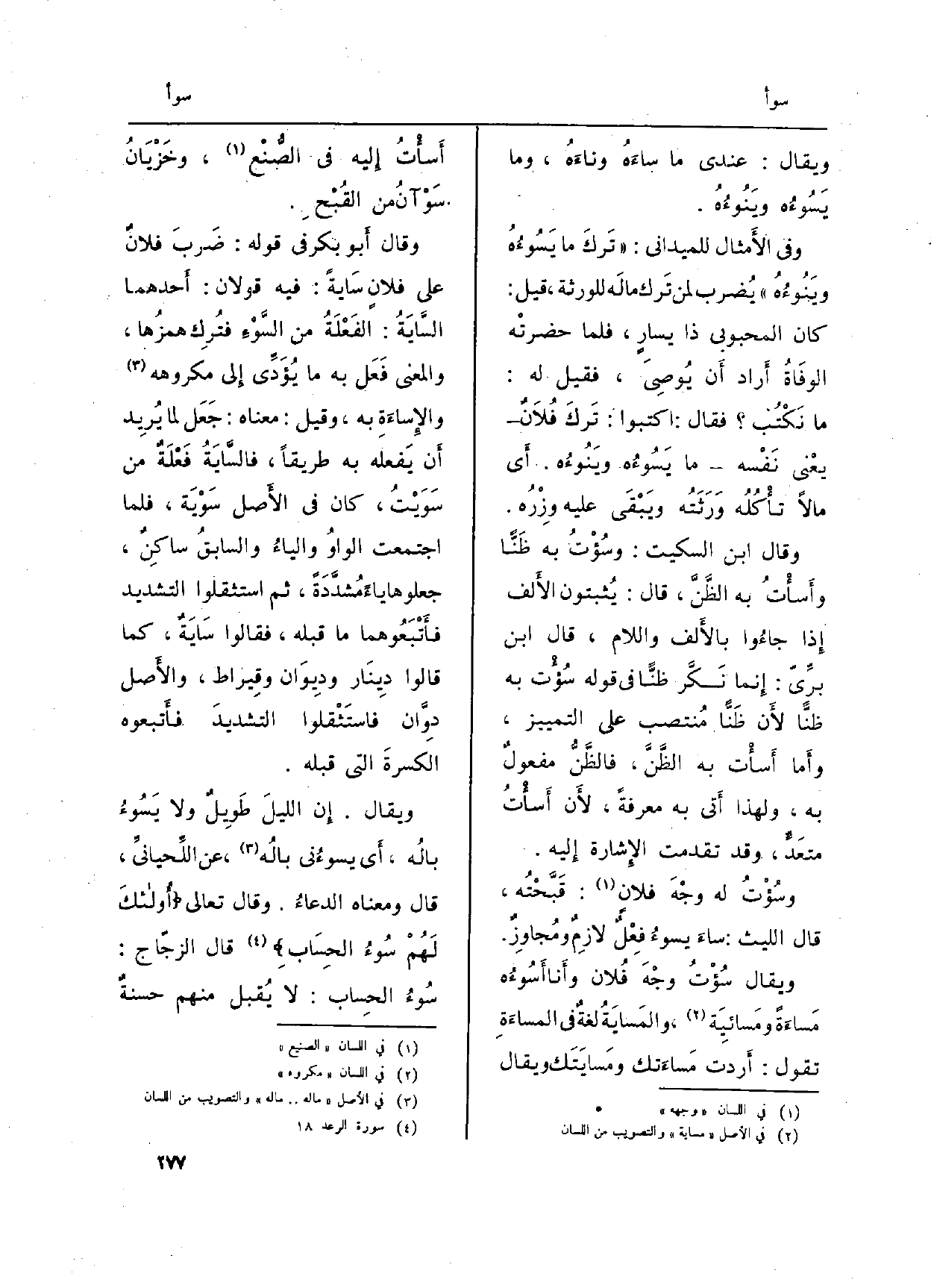 وَقَالَ ابْن السّكيت: {وسُؤْتُ بِهِ ظَنًّا وأَسأْتُ بِهِ الظَّنَّ، قَالَ: يُثيتون الأَلف إِذا جاءُوا بالأَلف وَاللَّام، قَالَ ابْن برِّيّ: إِنما نَكَّر ظنًّا فِي قَوْله سُؤْت بِهِ ظنًّا لأَن ظَنًّا مُنتصب على التَّمْيِيز، وأَما} أَسأْت بِهِ الظَّنَّ، فالظَّنُّ مفعولٌ بِهِ، وَلِهَذَا أَتى بِهِ معرفَة، لأَن أَسأْتُ متعَدَ، وَقد تقدّمت الإِشارة إِليه.
